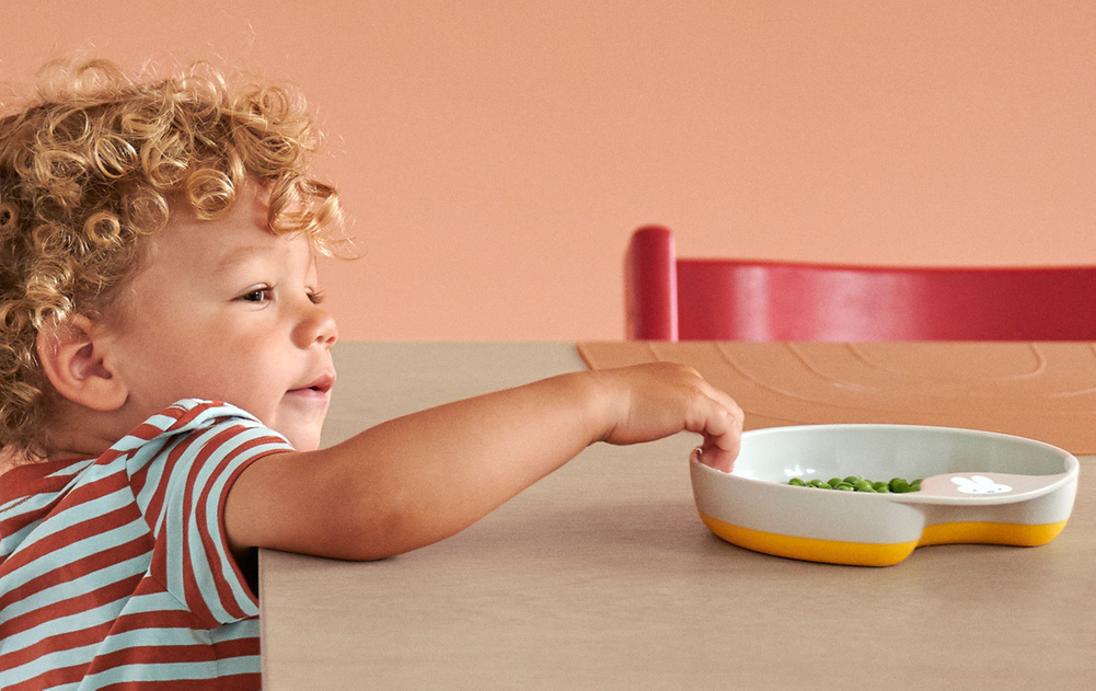 Talerzyk do nauki jedzenia Mio posiada zaokrąglony brzeg i wysokie krawędzie, by Maluch mógł komfortowo wybierać z niego jedzenie.