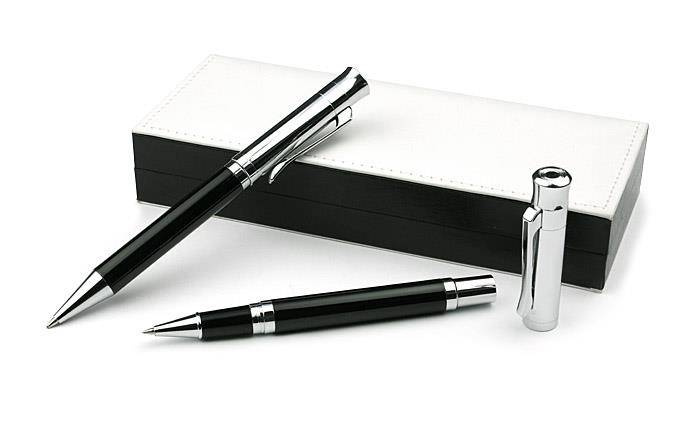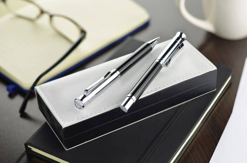 - Zawiera metalowy długopis i pióro kulkowe oraz etui wykonane z ekoskóry.
