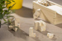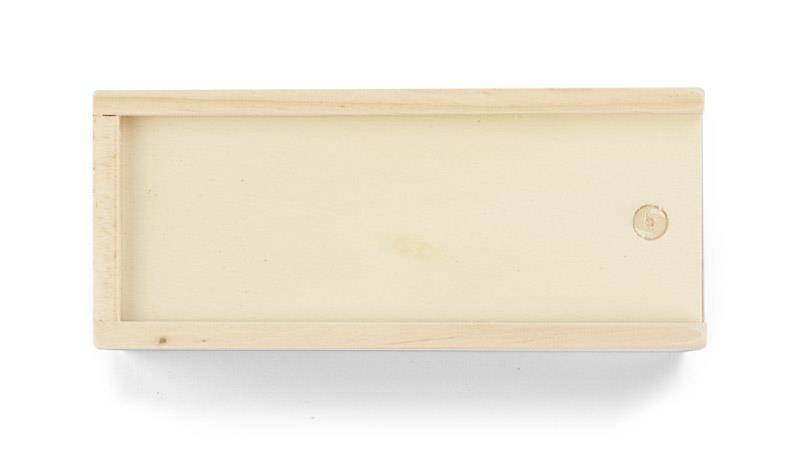 Zestaw pakowany w skrzyneczkę, wykonany z drewna.
