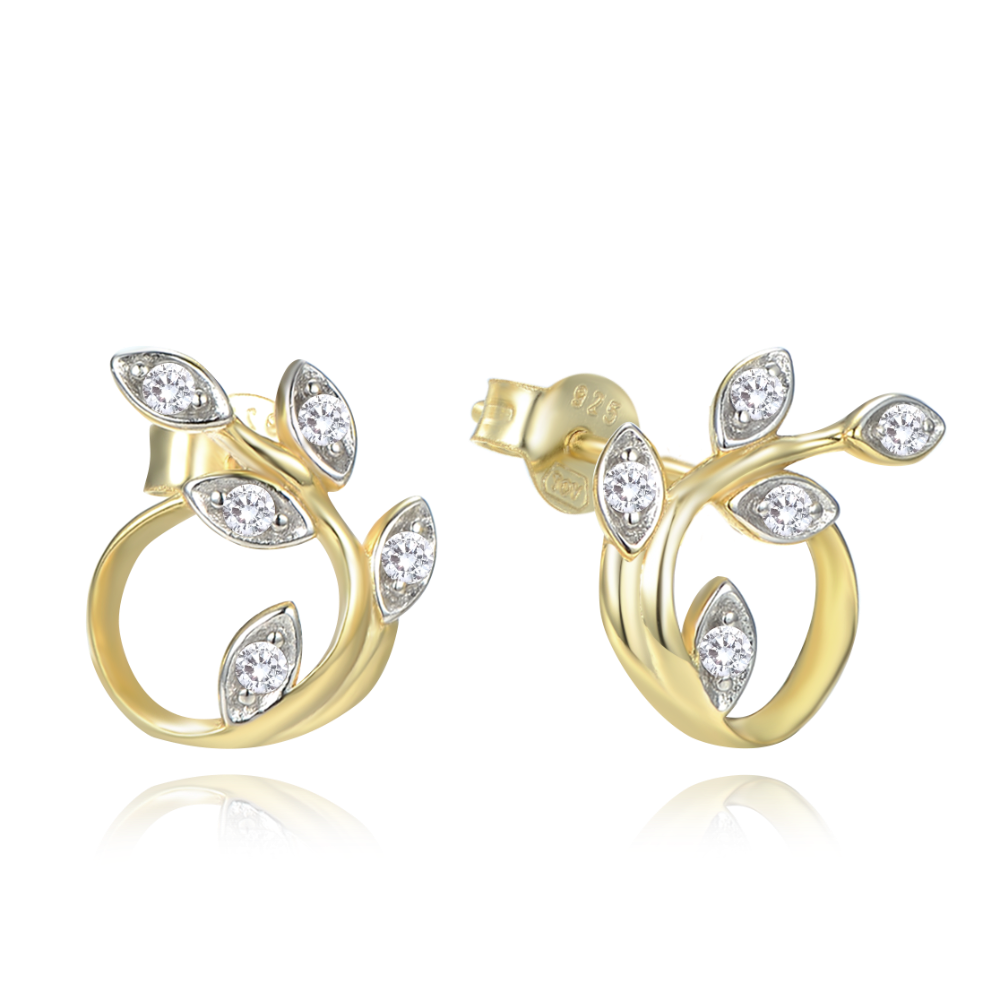 MINET Srebrne pozłacane kolczyki liście z białymi cyrkoniami