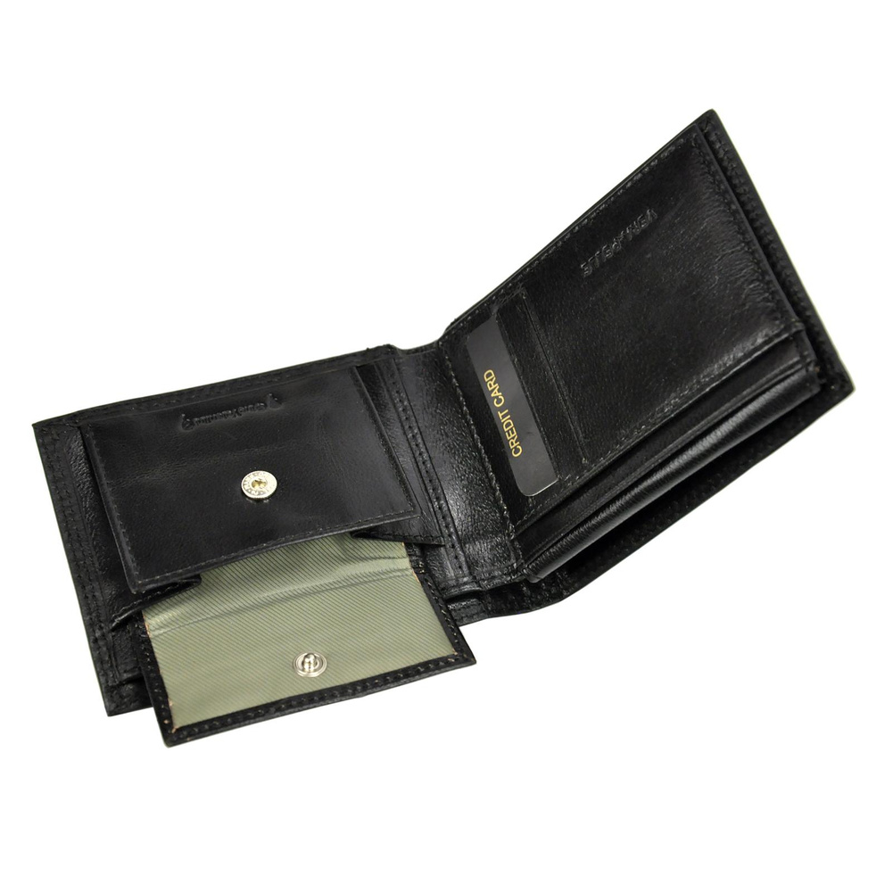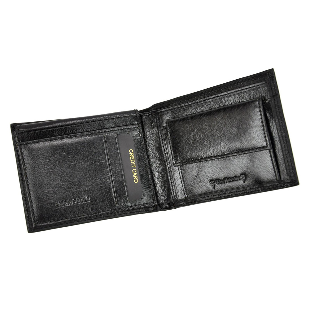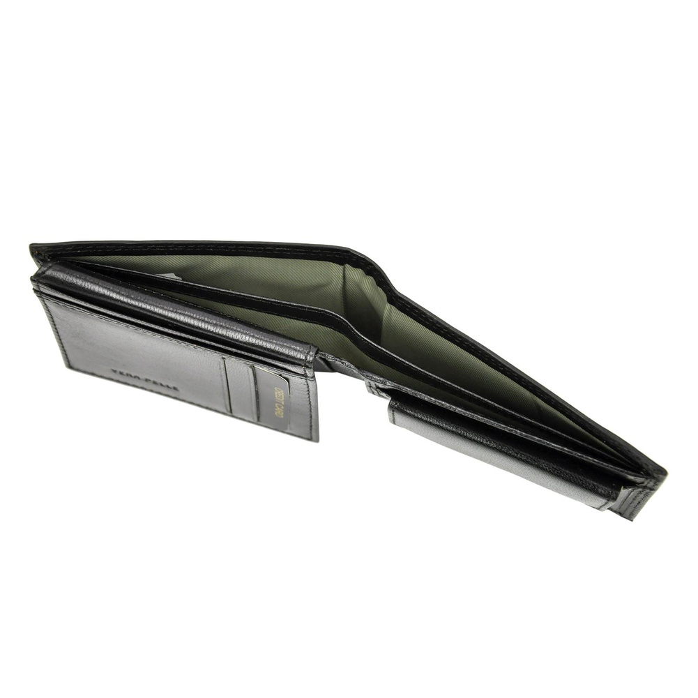 Wewnątrz dwie kieszenie do przechowywania monet, zamykane na zatrzask i suwak. Dodatkowo producent zadbał o dziesięć przegródek na karty oraz o pojemną komorę dla banknotów.
