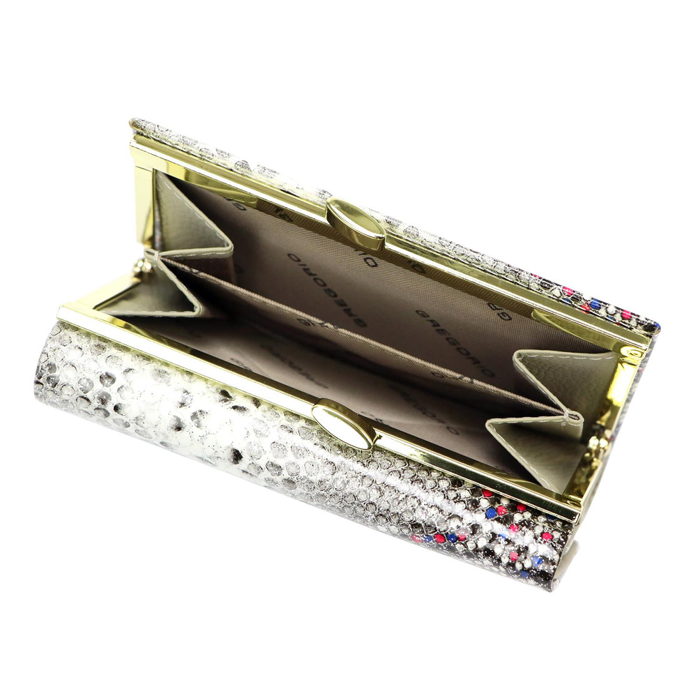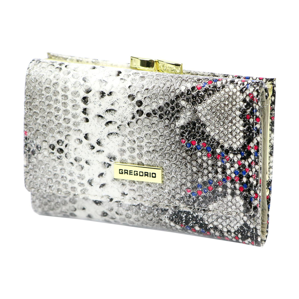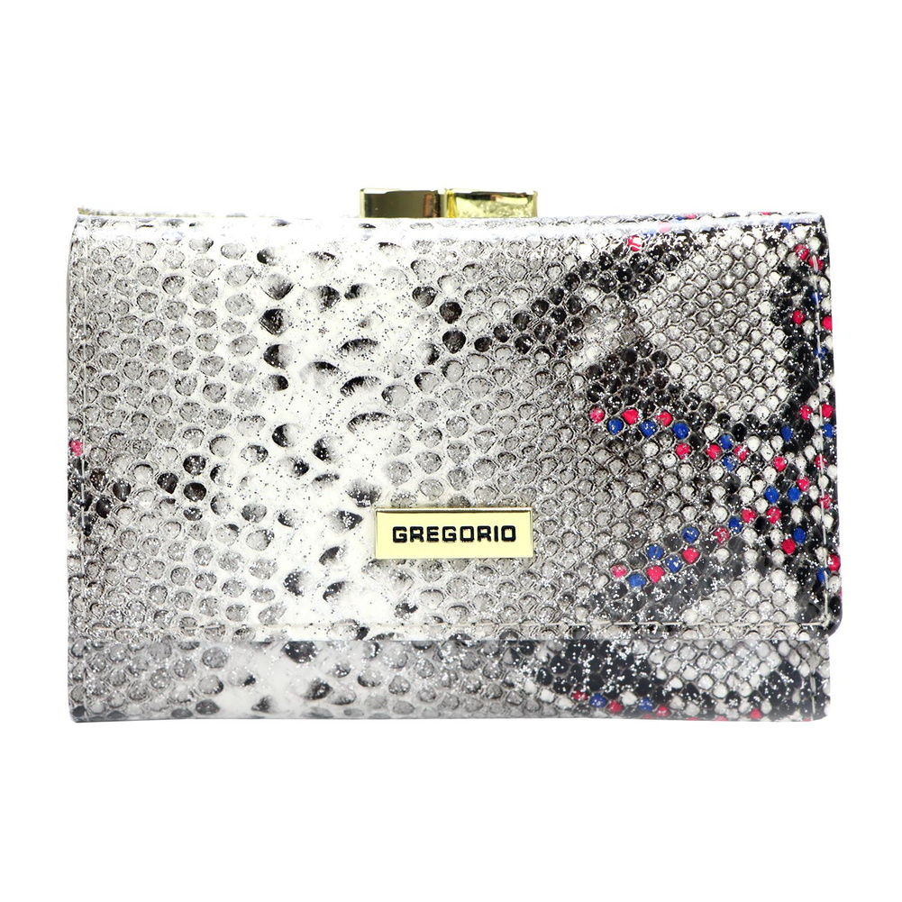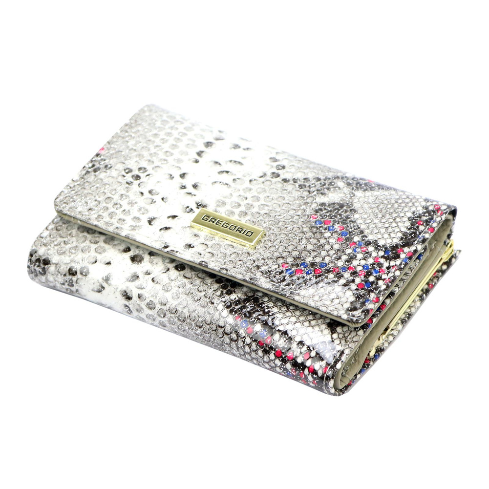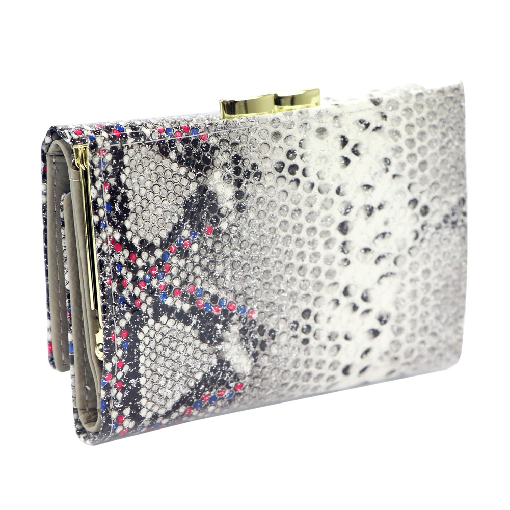 Portmonetka jest wykonana z naturalnej skóry o wyjątkowej fakturze skóry węża, co nadaje jej niepowtarzalny styl. Złote okucia tworzą piękny kontrast z materiałem, nadając całości luksusowy wygląd. Mały rozmiar i pozioma orientacja sprawiają, że jest idealnym dodatkiem do każdej damskiej torebki.