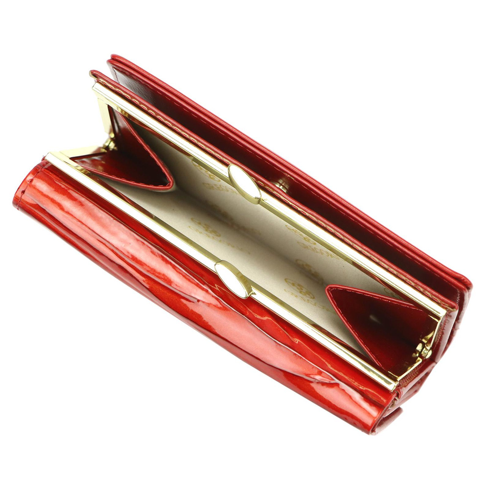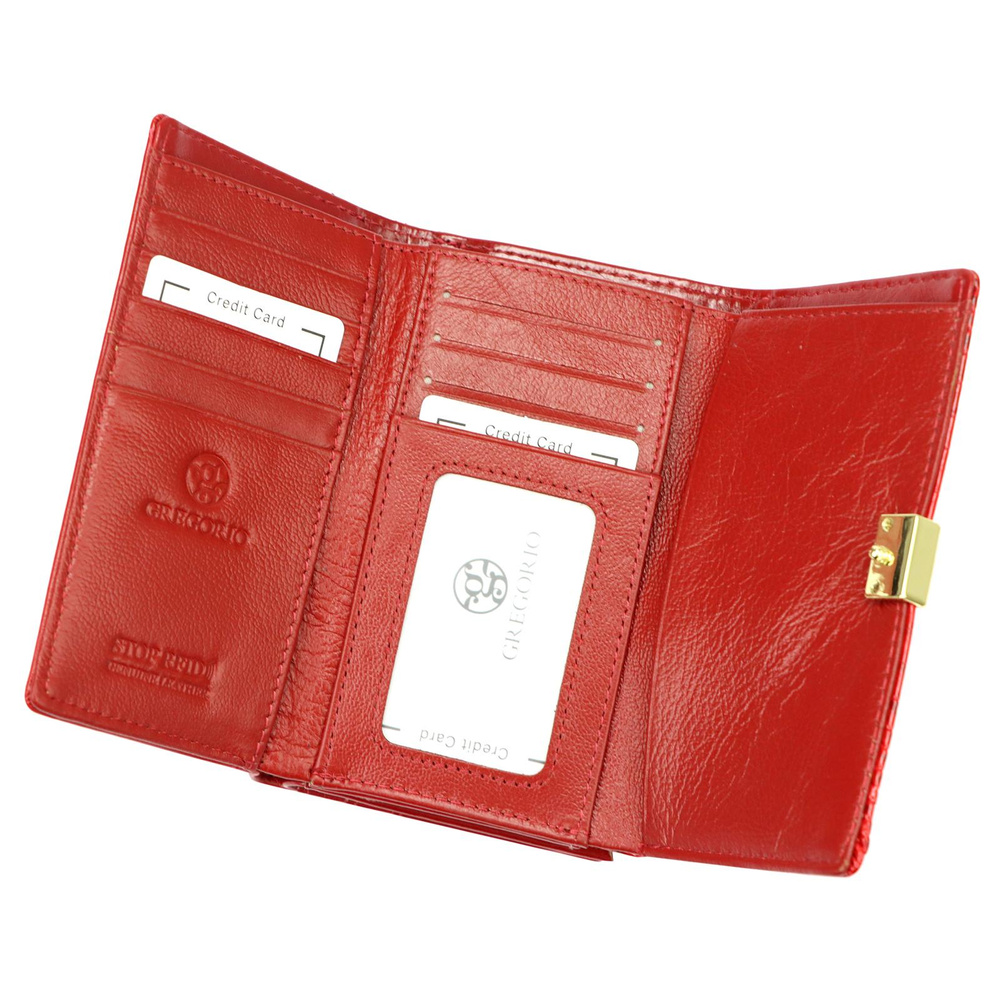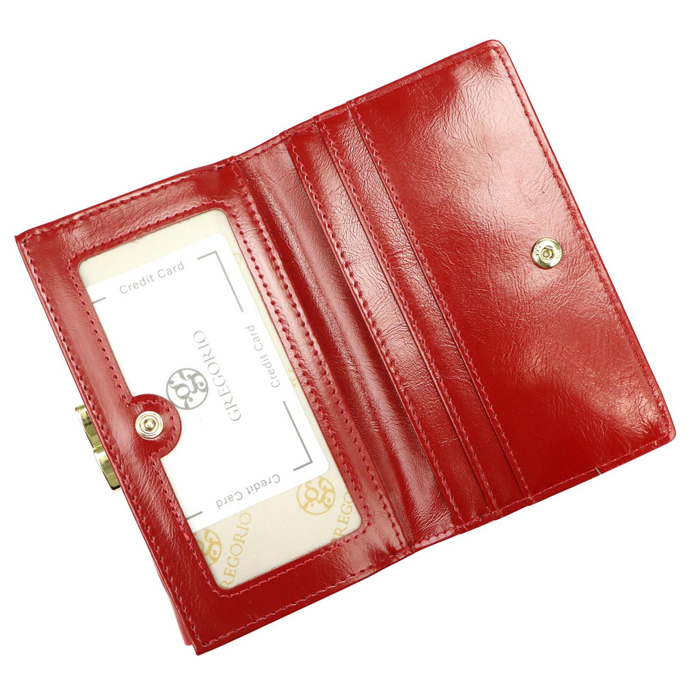 Wnętrze portfela Gregorio NL-108 zostało zaprojektowane z myślą o maksymalnej organizacji i bezpieczeństwie Twoich finansów. Portfel posiada jedną przegrodę na banknoty, w której zmieści się również dowód rejestracyjny, dwie przezroczyste kieszenie idealne na zdjęcia lub dokumenty identyfikacyjne oraz 12 miejsc na karty kredytowe, co pozwala na łatwy dostęp do najczęściej używanych kart. Dodatkowo, kieszeń na monety zapinana na bigiel zabezpiecza drobne przed przypadkowym wysypaniem. Całość zamykana jest na elegancki zatrzask z ozdobnym zapięciem z logiem producenta, co podnosi estetykę portfela i gwarantuje, że zawartość pozostanie na swoim miejscu.