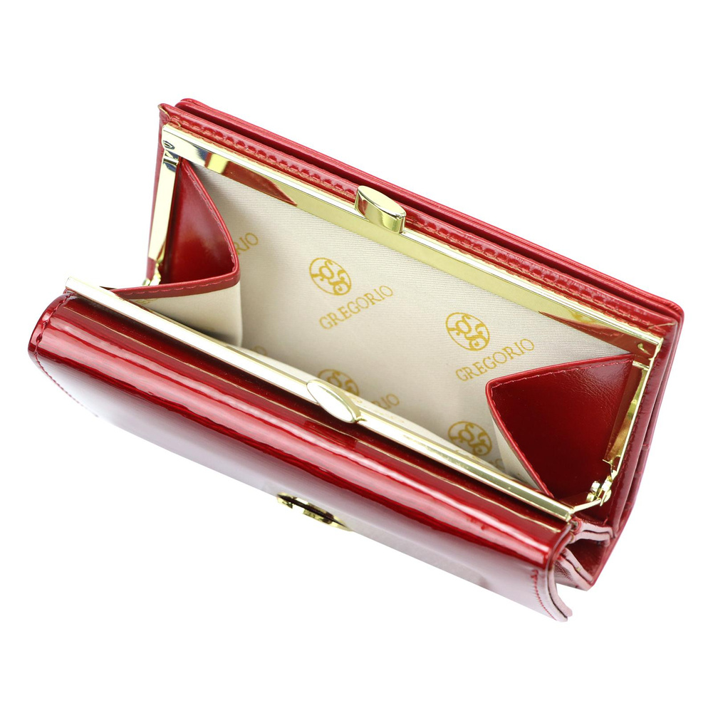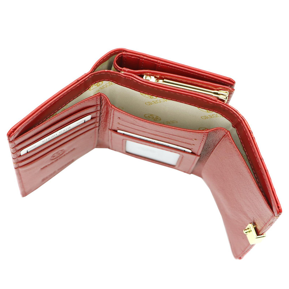 Wnętrze portfela Gregorio NL-108 zostało zaprojektowane z myślą o maksymalnej organizacji i bezpieczeństwie Twoich finansów. Portfel posiada jedną przegrodę na banknoty, w której zmieści się również dowód rejestracyjny, dwie przezroczyste kieszenie idealne na zdjęcia lub dokumenty identyfikacyjne oraz 12 miejsc na karty kredytowe, co pozwala na łatwy dostęp do najczęściej używanych kart. Dodatkowo, kieszeń na monety zapinana na bigiel zabezpiecza drobne przed przypadkowym wysypaniem. Całość zamykana jest na elegancki zatrzask z ozdobnym zapięciem z logiem producenta, co podnosi estetykę portfela i gwarantuje, że zawartość pozostanie na swoim miejscu.