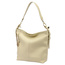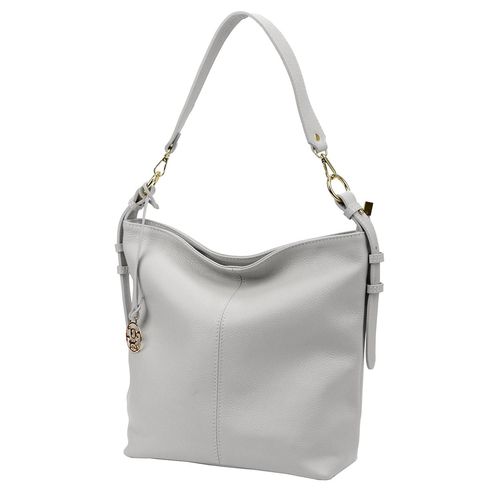 - Elegancka, duża torebka damska w kolorze jasnego popielu, wykonana z wysokiej jakości skóry naturalnej, z dopinanym paskiem i złotymi okuciami.