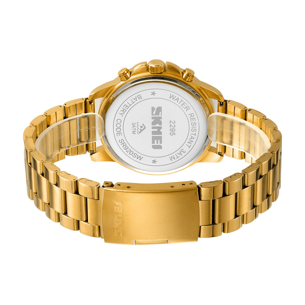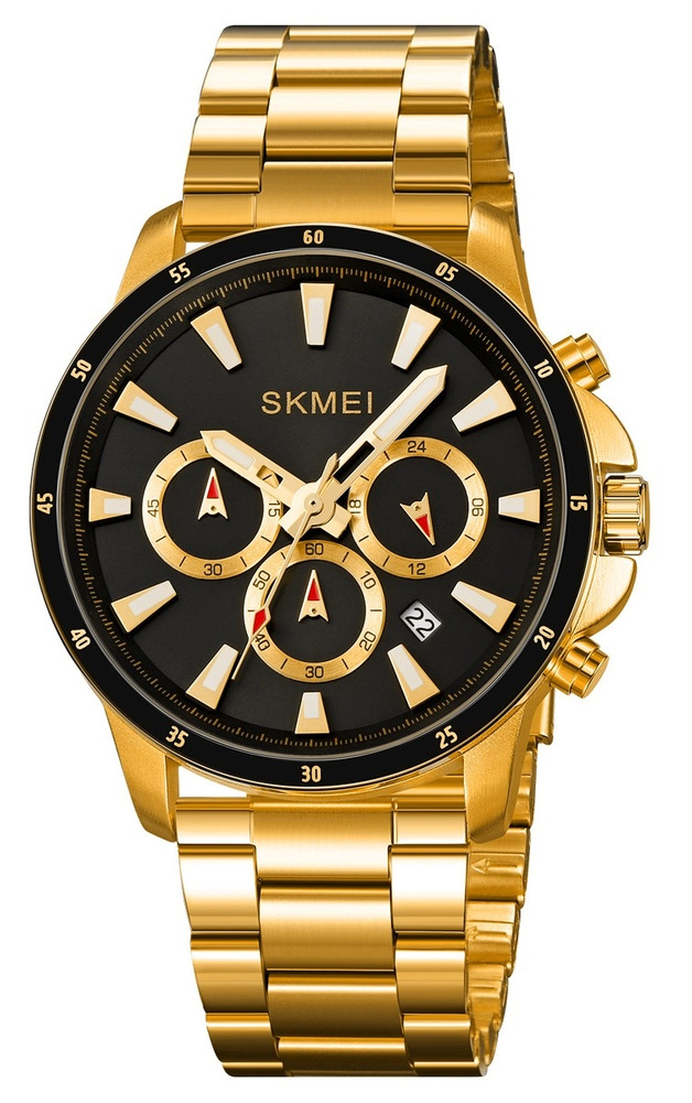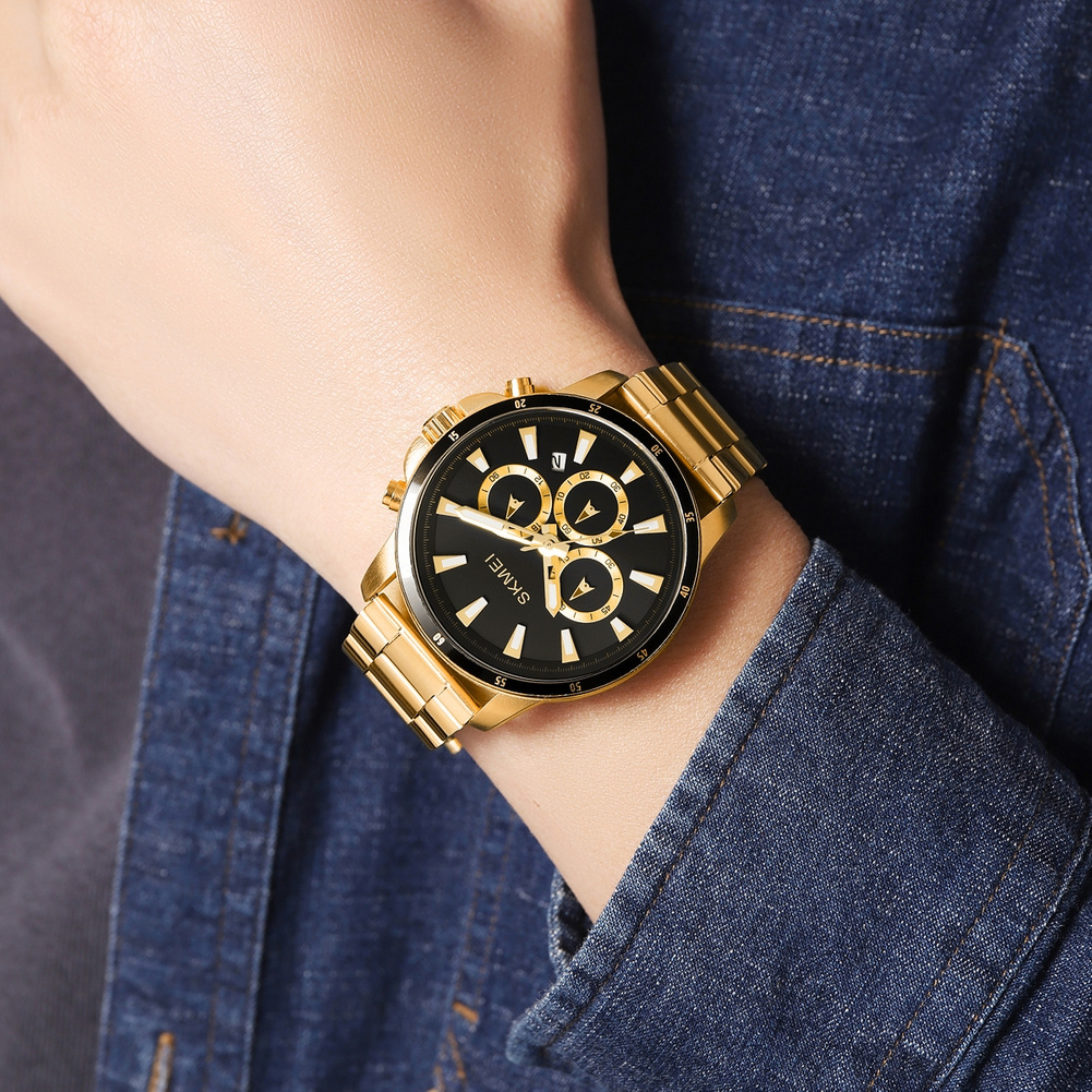 Zegarek Skmei 2295GD to elegancja i moc w jednym – jego złota koperta i bransoleta tworzą luksusowy, wyrazisty wygląd, który nie pozostanie niezauważony. Czarna tarcza z kontrastującymi, złotymi indeksami i wskazówkami daje świetną czytelność, a czerwony akcent na sekundniku dodaje sportowego charakteru. To model dla mężczyzny, który ceni styl, klasę i solidność, niezależnie od okazji.