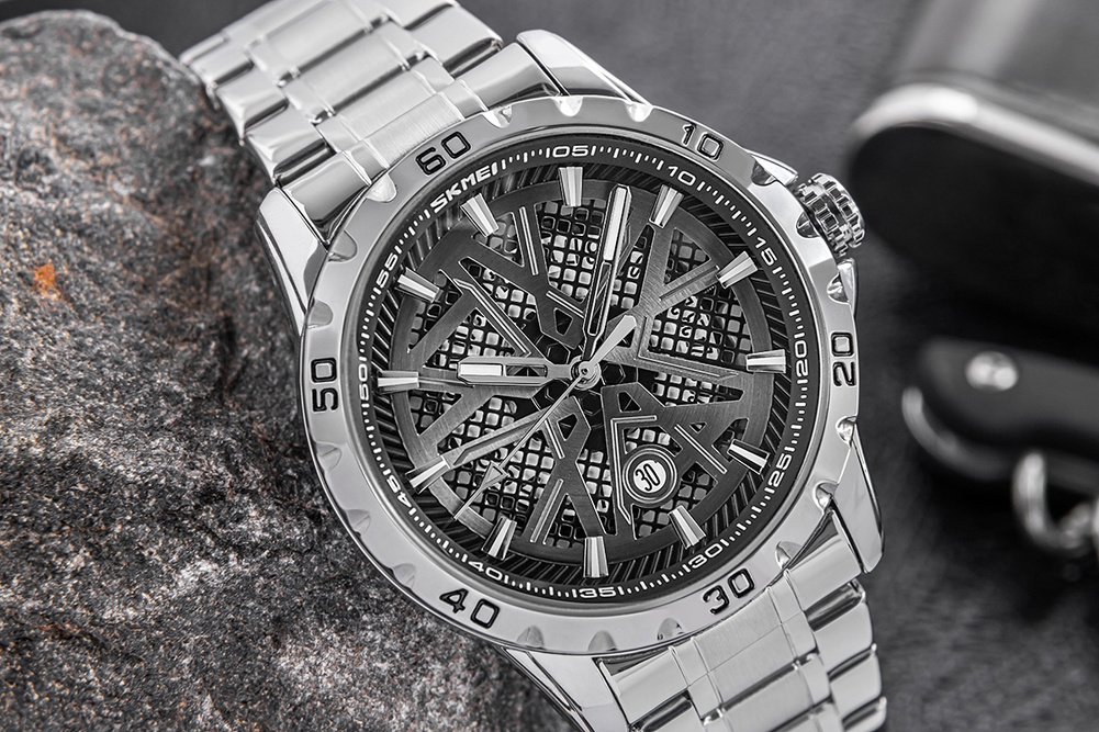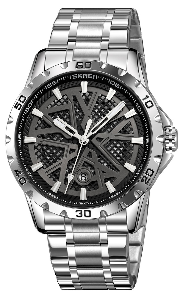 Zegarek Skmei 9337 to czysta, męska elegancja z pazurem – przyciąga uwagę wyrazistą, ale zarazem subtelną kolorystyką. Srebrna koperta i bransoleta tworzą solidną, klasyczną podstawę, która idealnie kontrastuje z trójwymiarową tarczą w odcieniach stalowej szarości. Taka tarcza z elementami 3D dodaje głębi i charakteru, a srebrne, fluorescencyjne indeksy i wskazówki sprawiają, że zegarek pozostaje czytelny o każdej porze.