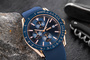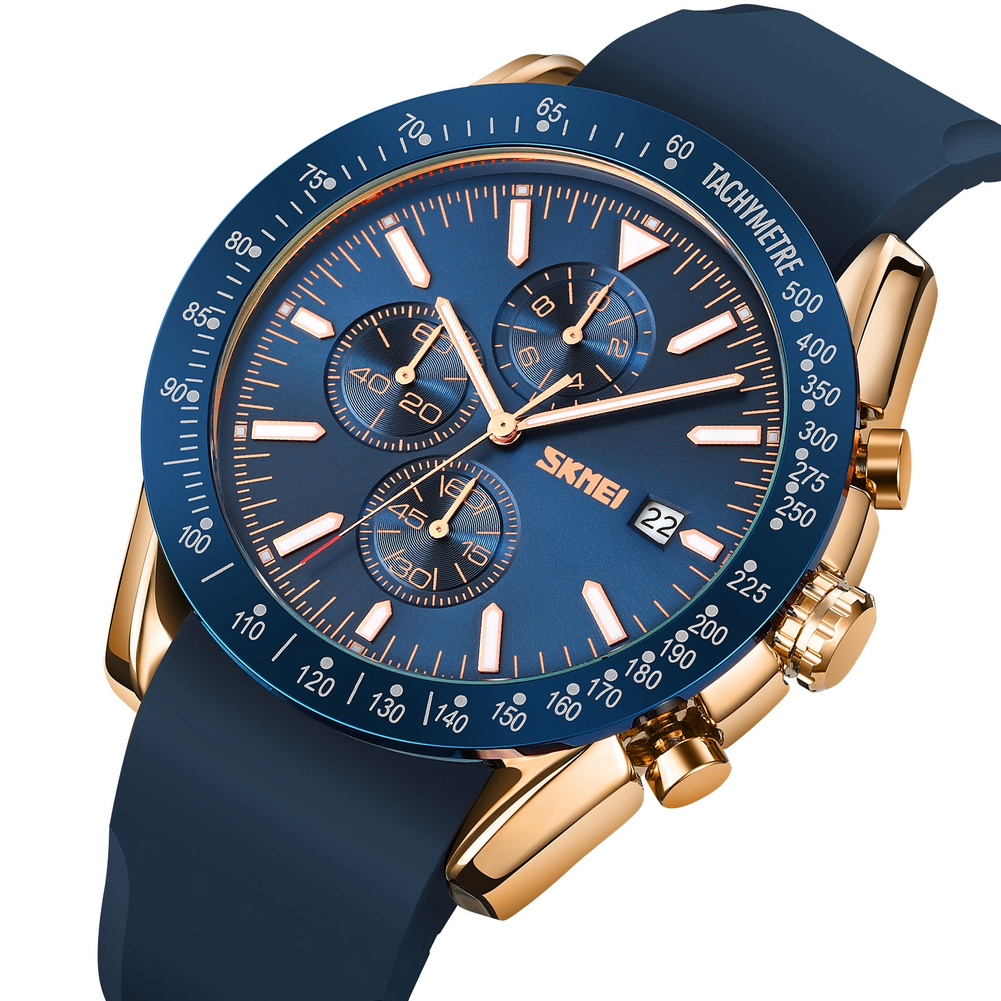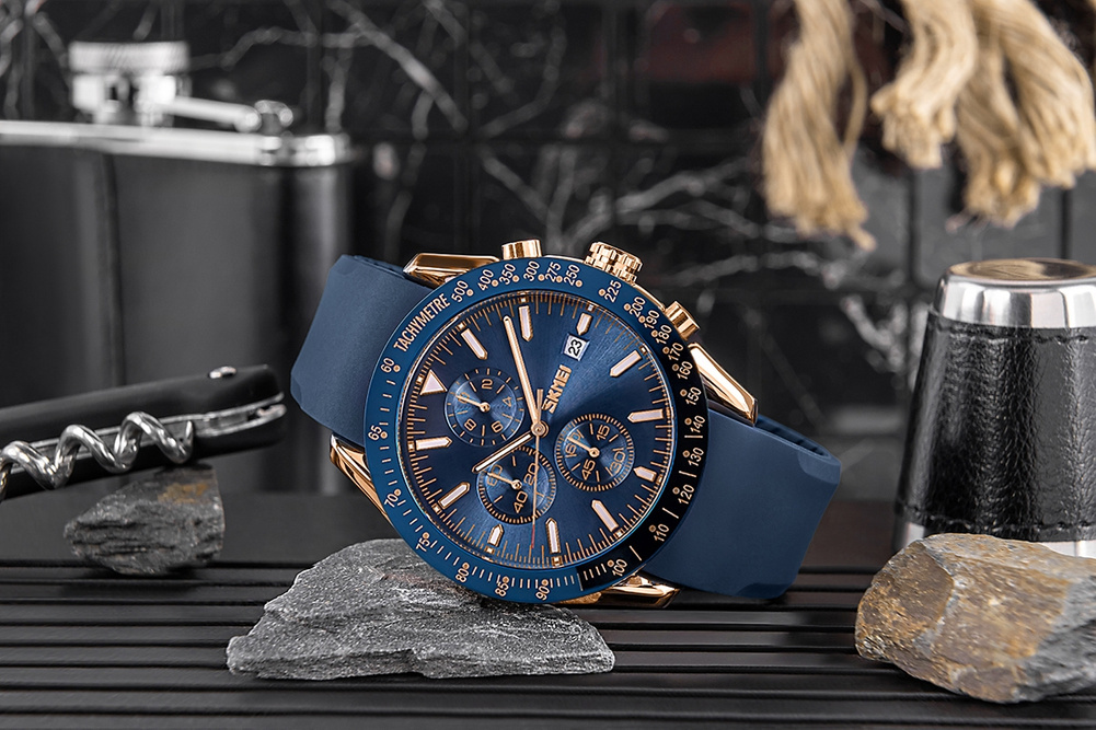 Zegarek Skmei 9253 w wersji z silikonowym paskiem prezentuje kolorystykę inspirowaną ekskluzywnymi czasomierzami premium, która dodaje mu wyjątkowego, dynamicznego charakteru. Miedziana koperta kontrastuje z głębokim, wyrazistym granatowym metalicznym bezlem i tarczą, tworząc luksusowy, sportowy wygląd, nawiązujący do stylu najlepszych światowych marek. Silikonowy pasek zapewnia dodatkowy komfort i lekkość, idealnie łącząc elegancję z funkcjonalnością, która sprawdzi się w każdej sytuacji.