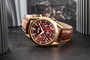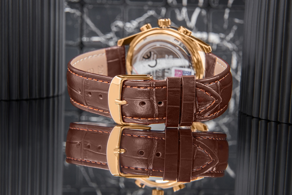 Tarcza z wyrazistymi miedzianymi detalami emanuje ponadczasową elegancją, którą trudno przeoczyć. Smukłe indeksy i precyzyjnie zaprojektowane subtarcze tworzą harmonijną kompozycję, która doskonale łączy tradycję z nowoczesnością. Solidna koperta w miedzianym odcieniu i perfekcyjnie wykończony skórzany pasek to elementy, które podkreślają charakter tego modelu – niezawodny, a jednocześnie wyrafinowany. Idealny model dla mężczyzny, który ceni prostotę, ale nie rezygnuje z wyrazistości i klasy.