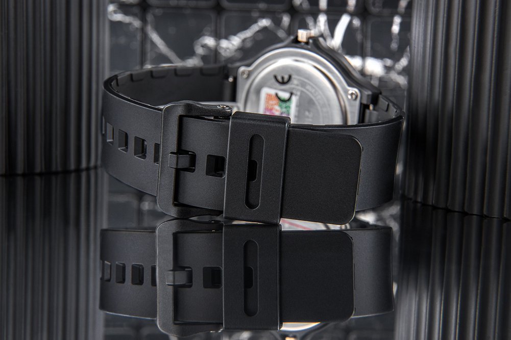 Pasek w tym modelu jest lekki i komfortowy, dzięki czemu zegarek nosi się bardzo przyjemnie, nawet przez cały dzień. Tworzywo sztuczne jest także odporne na wodę i zmienne warunki atmosferyczne, co sprawia, że ten model sprawdzi się idealnie podczas aktywności na świeżym powietrzu czy w deszczowy dzień. Pasek nadaje zegarkowi nowoczesny, modny wygląd, który łatwo dopasować zarówno do sportowych, jak i codziennych stylizacji. Tworzywo sztuczne jest również niezwykle łatwe w pielęgnacji – wystarczy przetrzeć pasek wilgotną szmatką, by wyglądał jak nowy.