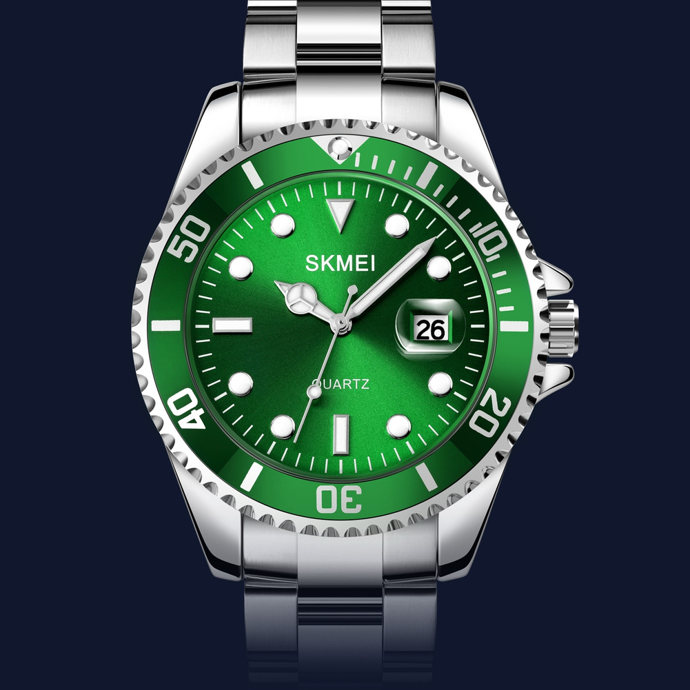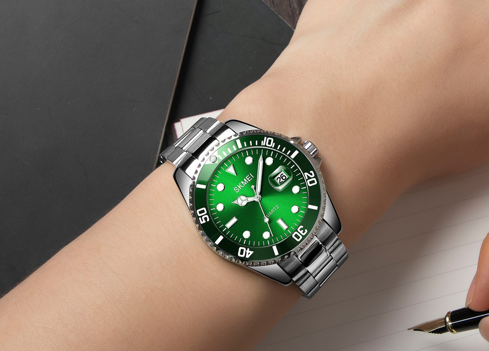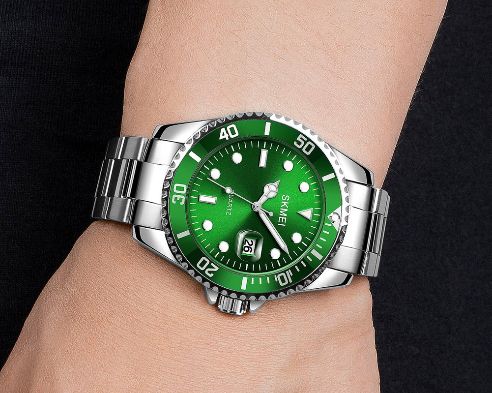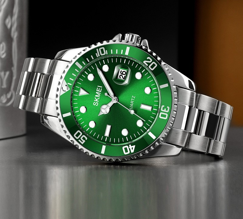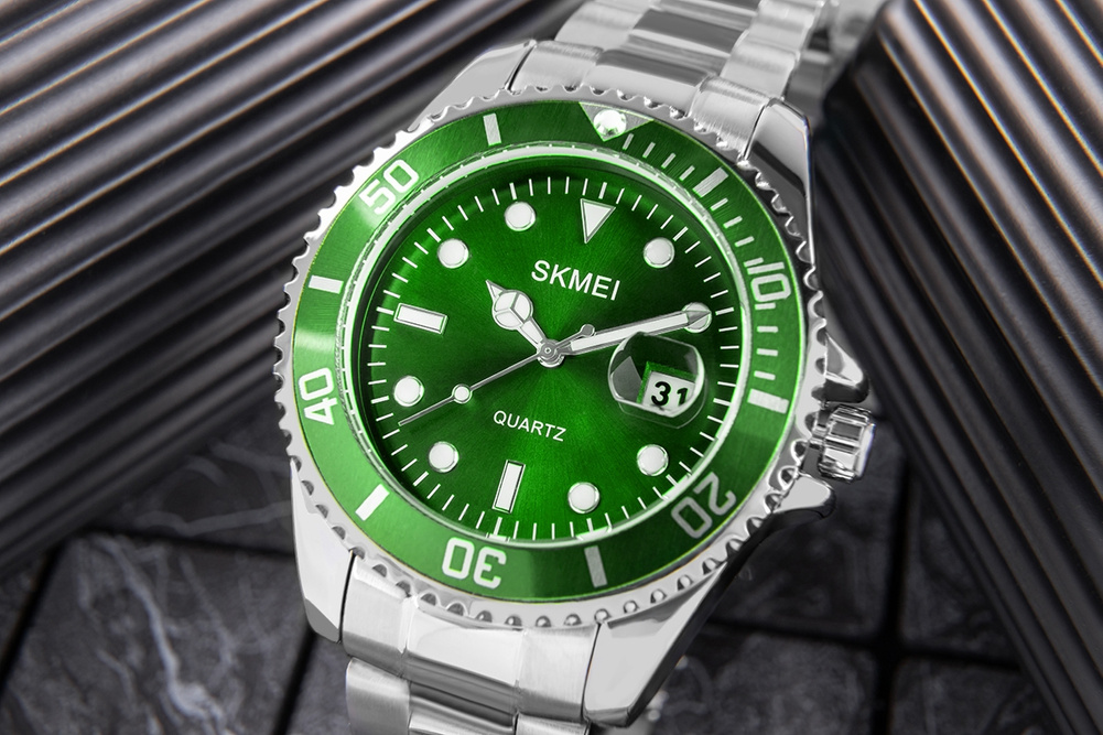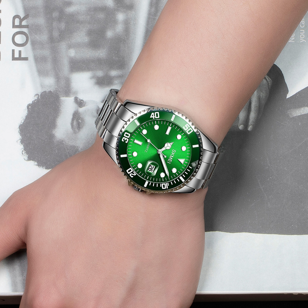 Od teraz luksusowy design możesz mieć na swoim nadgarstku. Model SKMEI 1779 swoim wyglądem nawiązuje do ekskluzywnych zegarków z serii Rolex Submariner "Hulk", które są ikoną w świecie zegarków nurkowych. Zielona tarcza i bezel w intensywnym odcieniu, charakterystyczne wypukłe szkło powiększające nad datownikiem oraz stalowa bransoleta to cechy bardzo zbliżone do legendarnego modelu Rolexa.