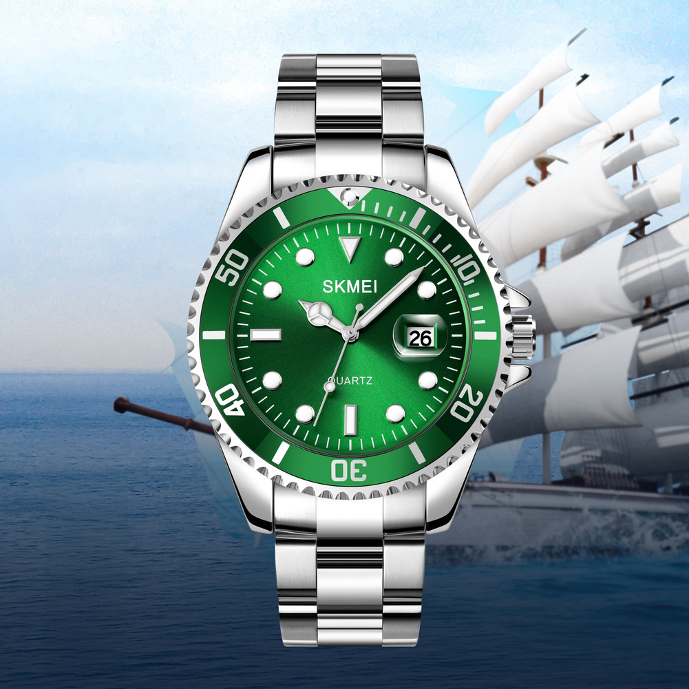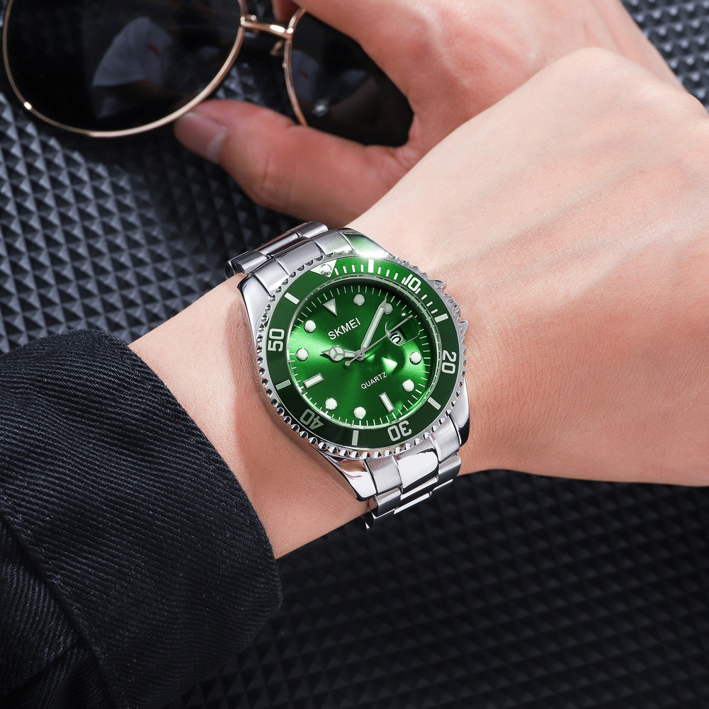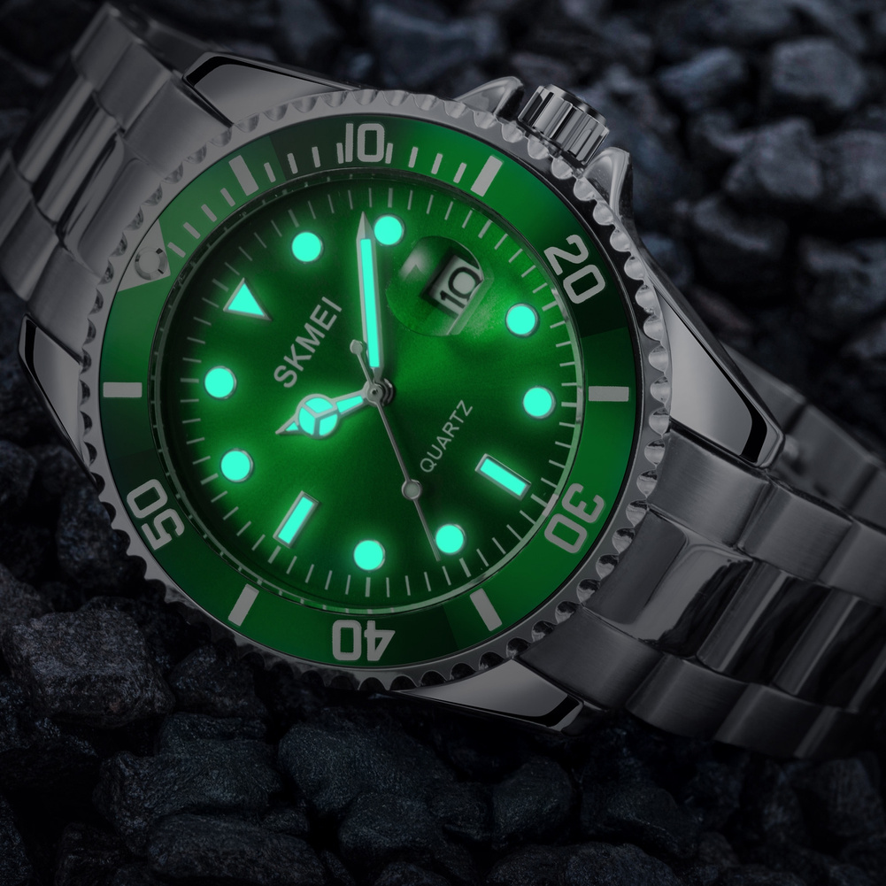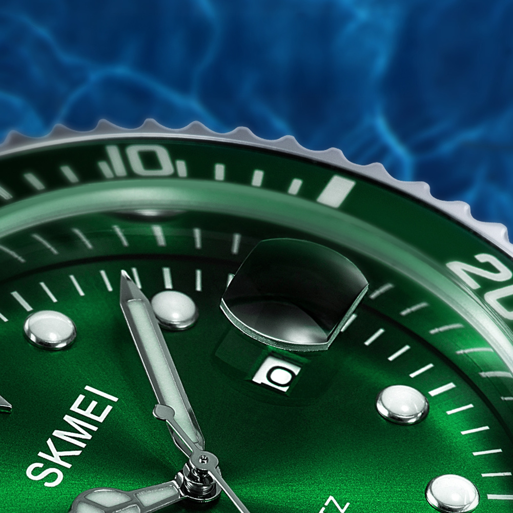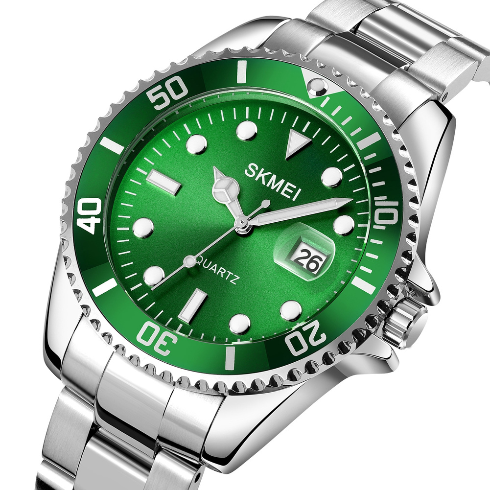 Od teraz luksusowy design możesz mieć na swoim nadgarstku. Model SKMEI 1779 swoim wyglądem nawiązuje do ekskluzywnych zegarków z serii Rolex Submariner "Hulk", które są ikoną w świecie zegarków nurkowych. Zielona tarcza i bezel w intensywnym odcieniu, charakterystyczne wypukłe szkło powiększające nad datownikiem oraz stalowa bransoleta to cechy bardzo zbliżone do legendarnego modelu Rolexa.