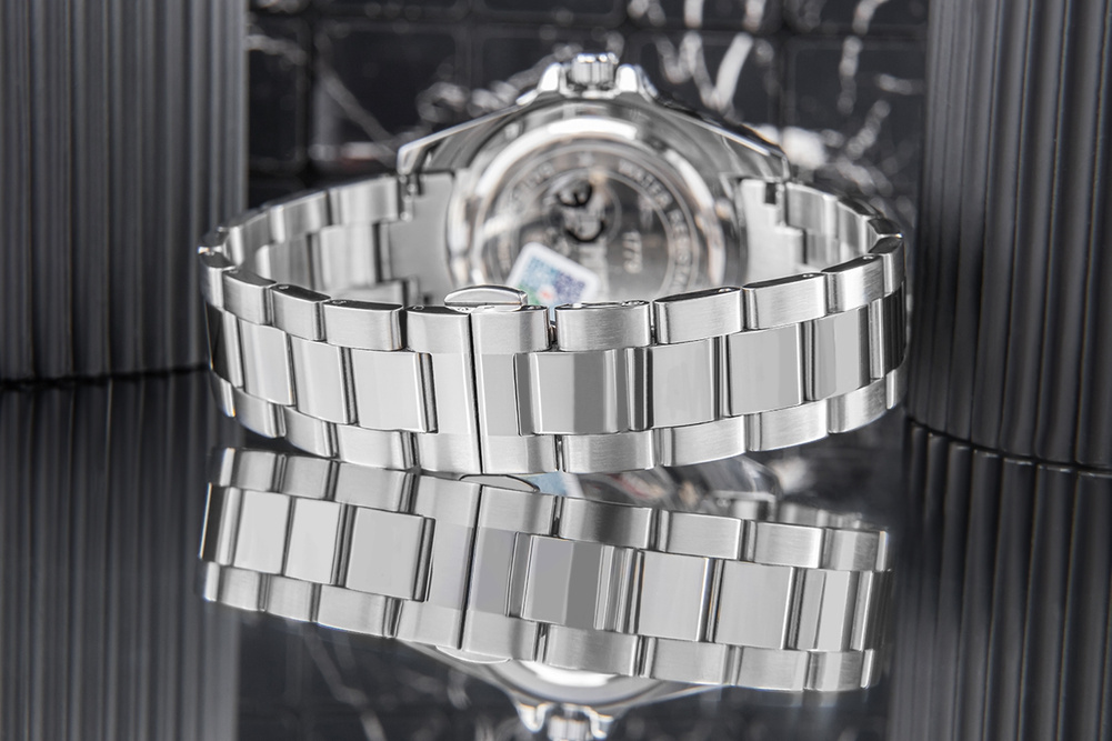 Model zachwyca swoją wypukłą formą koperty, która nadaje mu solidności i męskiego charakteru. Delikatne zaokrąglenia oraz precyzyjne wykończenie koperty nie tylko podkreślają jej elegancki wygląd, ale również zapewniają wygodę noszenia na co dzień. Charakterystyczne połączenie ogniw w bransolecie, z wyraźnie zaznaczonymi środkowymi segmentami, nadaje jej dynamicznego i wyrafinowanego stylu. Dodatkowo, obrotowy bezel, z wyraźnymi oznaczeniami minutowymi, wzorowany na profesjonalnych zegarkach nurkowych, dodaje sportowego charakteru i praktyczności.