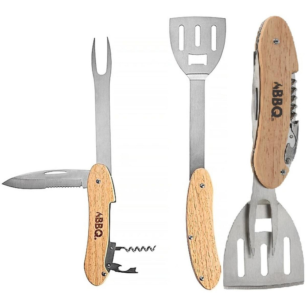 Zestaw składa się z 5 ukrytych w trzonku narzędzi: szpatułki, widelca, nożyka, korkociągu i otwieracza do butelek.