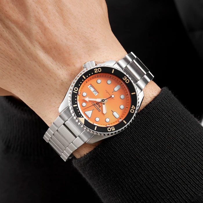 Seiko 5 to męski zegarek o nowoczesnym i wyrazistym charakterze, który przyciąga uwagę dzięki unikalnej pomarańczowej tarczy. Wykonany z najwyższej jakości materiałów, takich jak stal nierdzewna i chirurgiczna, łączy trwałość z eleganckim stylem. Luminescencyjne wskazówki i indeksy zapewniają czytelność w każdych warunkach.