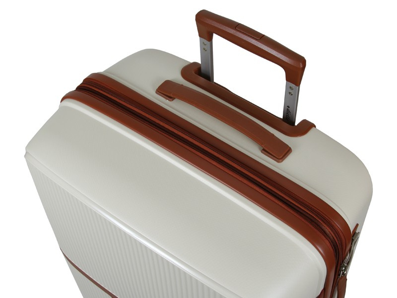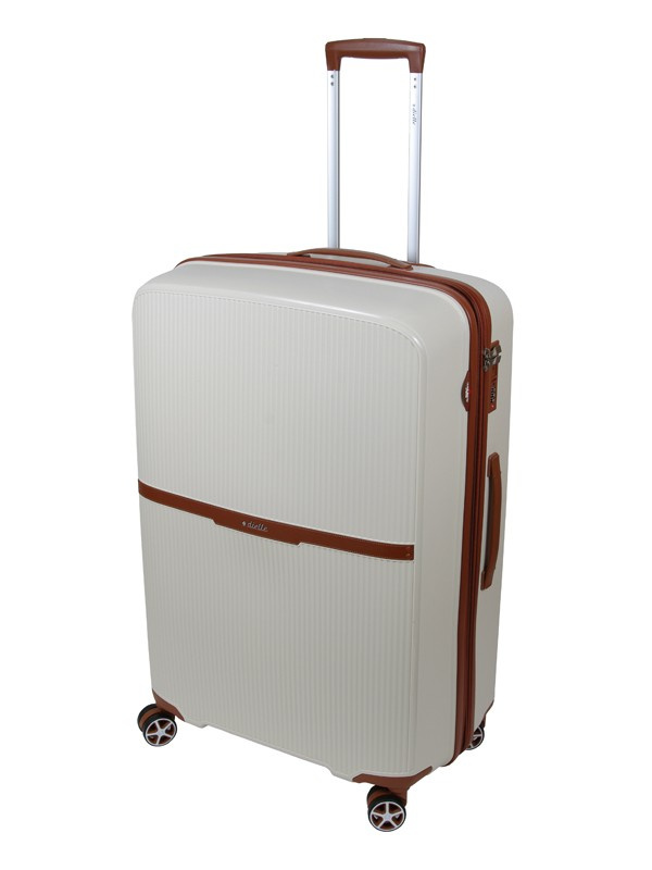 Duża walizka włoskiej marki Dielle z kolekcji 190. Korpus wykonany z polipropylenu. Wygodne uchwyty z boku i u góry ułatwiają umieszczenie jej w bagażniku auta lub zdjęcie z lotniskowego transportera. Cztery podwójne, osiowo obrotowe kółka gwarantują komfort przemieszczania się. Wysuwany teleskopowo , regulowany stelaż. Przewożoną zawartość chroni zamek szyfrowy w standardzie TSA. Dodatkowym atutem tej kolekcji jest możliwość poszerzenia walizki o około 5 centymetrów dzięki specjalnemu suwakowi. Wnętrze wyłożone elegancką podszewką, jedna część wyposażona w pasy do mocowania przewożonego bagażu a druga część wydzielona materiałową przegrodą z dodatkowymi kieszeniami. Walizka charakteryzuje się wyjątkowym wyglądem oraz jakością wykonania.