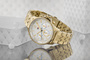 Model, który kusi złotym blaskiem i subtelnymi detalami. Jego wyjątkowa bransoleta, z ogniwami w kształcie litery H, otula nadgarstek niczym biżuteryjne objęcie, podkreślając wyrafinowany styl właścicielki. Kontrast pomiędzy czystą bielą tarczy a złotymi indeksami i wskazówkami nadaje kompozycji lekkości i szyku, podczas gdy granatowy sekundnik wprowadza intrygujący akcent, niczym delikatny przebłysk nowoczesności. Całość uzupełnia złota koperta i koronka, które dodają luksusu każdemu detalowi, sprawiając, że zegarek staje się zarówno praktycznym, jak i wyrafinowanym dodatkiem, idealnym na każdą okazję.