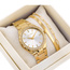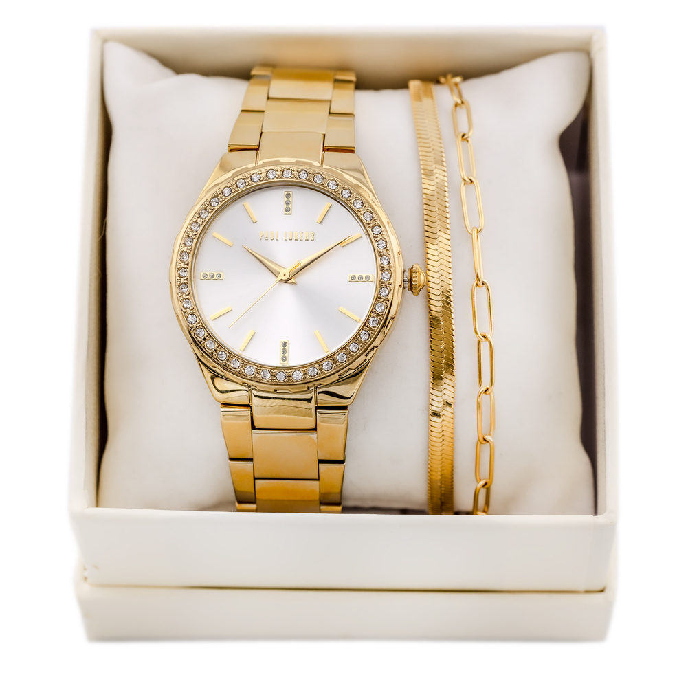 Komplet prezentowy damski, który zachwyca swoją elegancją i ponadczasowym stylem. Zawiera zegarek ze stali szlachetnej marki Paul Lorens w kolorze złotym, z piękną tarczą w kolorze srebrnym, która subtelnie podkreśla jego klasyczny charakter. Złota koperta zegarka, ozdobiona błyszczącymi cyrkoniami, dodaje całości wyjątkowego blasku. Zegarek charakteryzuje się także wodoszczelnością WR30, co sprawia, że jest praktyczny i funkcjonalny. Do kompletu dołączona jest podwójna bransoletka w kolorze złotym, która perfekcyjnie komponuje się z zegarkiem. To idealny wybór na prezent – elegancki, piękny i niezapomniany.