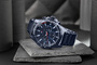 Metaliczny granat koperty i tarczy emanuje elegancją i nowoczesnością, świetnie sprawdzając się zarówno w formalnych, jak i codziennych stylizacjach. Granatowo-białe indeksy wprowadzają subtelny kontrast, podkreślając dbałość o detale, a dynamiczny czerwony sekundnik dodaje energii i wyrazistości, idealny dla pewnych siebie mężczyzn. Bransoleta w granatowej tonacji z matowo-metalicznym wykończeniem łączy surowość z elegancją, nadając zegarkowi wszechstronności – doskonale sprawdzi się na spotkaniach biznesowych, jak i na wieczornych wyjściach. To zegarek, który nie tylko mierzy czas, ale również definiuje Twój styl.