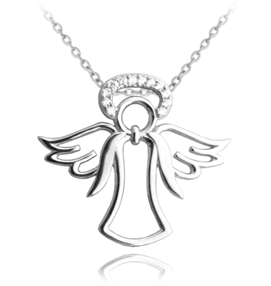 Srebrny naszyjnik z cherubinem zachwyca aureolą z dżetów.