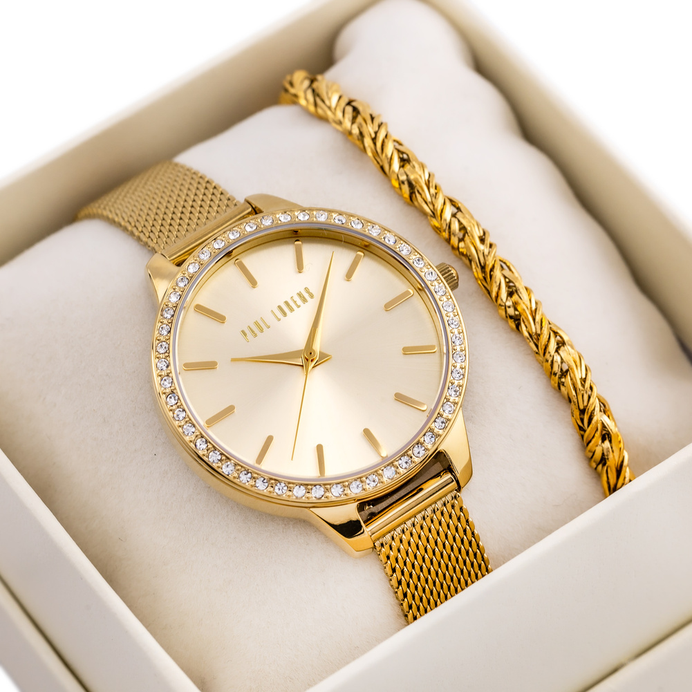 Komplet prezentowy damski, który zachwyca swoją elegancją i ponadczasowym stylem. Zawiera zegarek ze stali szlachetnej marki Paul Lorens w kolorze złotym, z piękną tarczą w kolorze srebrnym, która subtelnie podkreśla jego klasyczny charakter. Złota koperta zegarka, ozdobiona błyszczącymi cyrkoniami, dodaje całości wyjątkowego blasku. Zegarek charakteryzuje się także wodoszczelnością WR30, co sprawia, że jest praktyczny i funkcjonalny. Do kompletu dołączona jest elegancka pleciona bransoletka w kolorze złotym, która perfekcyjnie komponuje się z zegarkiem. To idealny wybór na prezent – elegancki, piękny i niezapomniany.