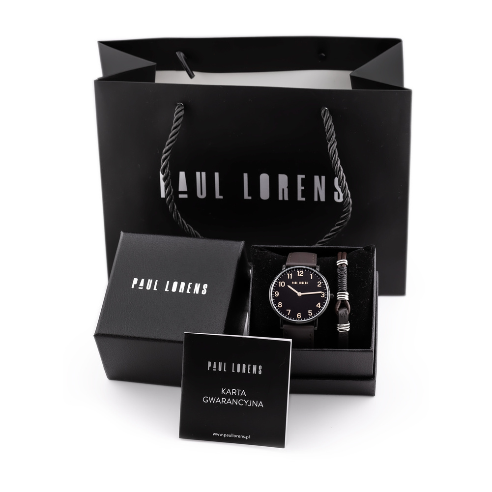 Komplet prezentowy męski, który łączy elegancję z ponadczasowym stylem. Zawiera zegarek marki Paul Lorens, na czarnym pasku, z klasyczną, czarną tarczą ozdobioną beżowym indeksem, co nadaje mu subtelną i wyrafinowaną estetykę. Czarna koperta zegarka doskonale komponuje się z całością, tworząc wyjątkowy design. Zegarek charakteryzuje się wodoszczelnością WR30, co zapewnia jego funkcjonalność i trwałość. Komplet zawiera również skórzaną, brązową bransoletę, która stanowi doskonałe uzupełnienie całości. To idealny wybór na święta – elegancki, męski i wyjątkowy prezent, który zachwyci każdego..