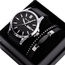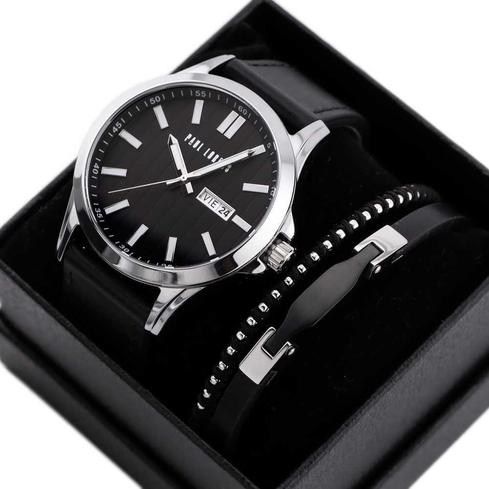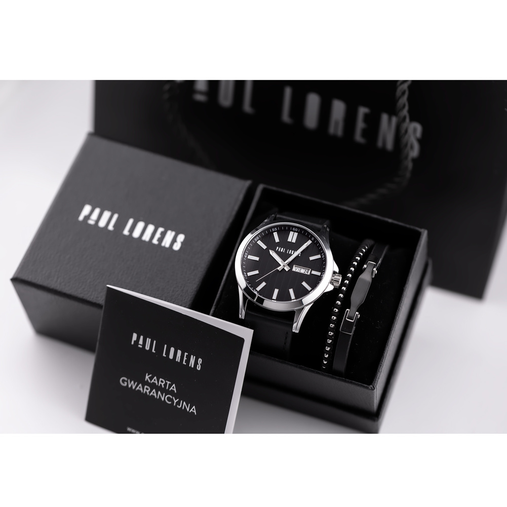Komplet prezentowy męski, który łączy elegancję z ponadczasowym stylem. Zawiera zegarek marki Paul Lorens, na czarnym pasku, z klasyczną, czarną tarczą ozdobioną srebrnym indeksem, co nadaje mu subtelną i wyrafinowaną estetykę. Srebrna koperta zegarka doskonale komponuje się z całością, tworząc wyjątkowy design. Zegarek charakteryzuje się wodoszczelnością WR30, co zapewnia jego funkcjonalność i trwałość. Komplet zawiera również skórzaną, czarna bransoletę ze srebrnymi elementami, która stanowi doskonałe uzupełnienie całości. To idealny wybór na święta – elegancki, męski i wyjątkowy prezent, który zachwyci każdego.