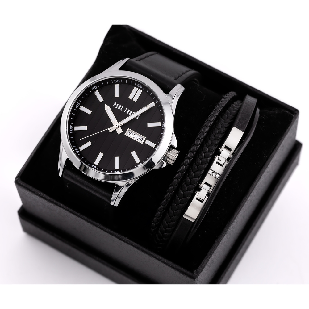 Komplet prezentowy męski, który łączy elegancję z ponadczasowym stylem. Zawiera zegarek marki Paul Lorens, na czarnym pasku, z klasyczną, czarną tarczą ozdobioną indeksem w kolorze srebrnym, co nadaje mu subtelną i wyrafinowaną estetykę. Koperta zegarka w kolorze srebrnym doskonale komponuje się z całością, tworząc wyjątkowy design. Zegarek charakteryzuje się wodoszczelnością WR30, co zapewnia jego funkcjonalność i trwałość. Komplet zawiera również skórzaną, czarna bransoletę z elementami srebrnymi, która stanowi doskonałe uzupełnienie całości. To idealny wybór na święta – elegancki, męski i wyjątkowy prezent, który zachwyci każdego.
