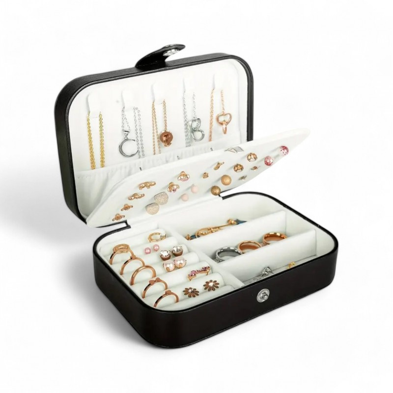 Funkcjonalna szkatułka z przegródkami oraz miejscami na naszyjniki, kolczyki i pierścionki.