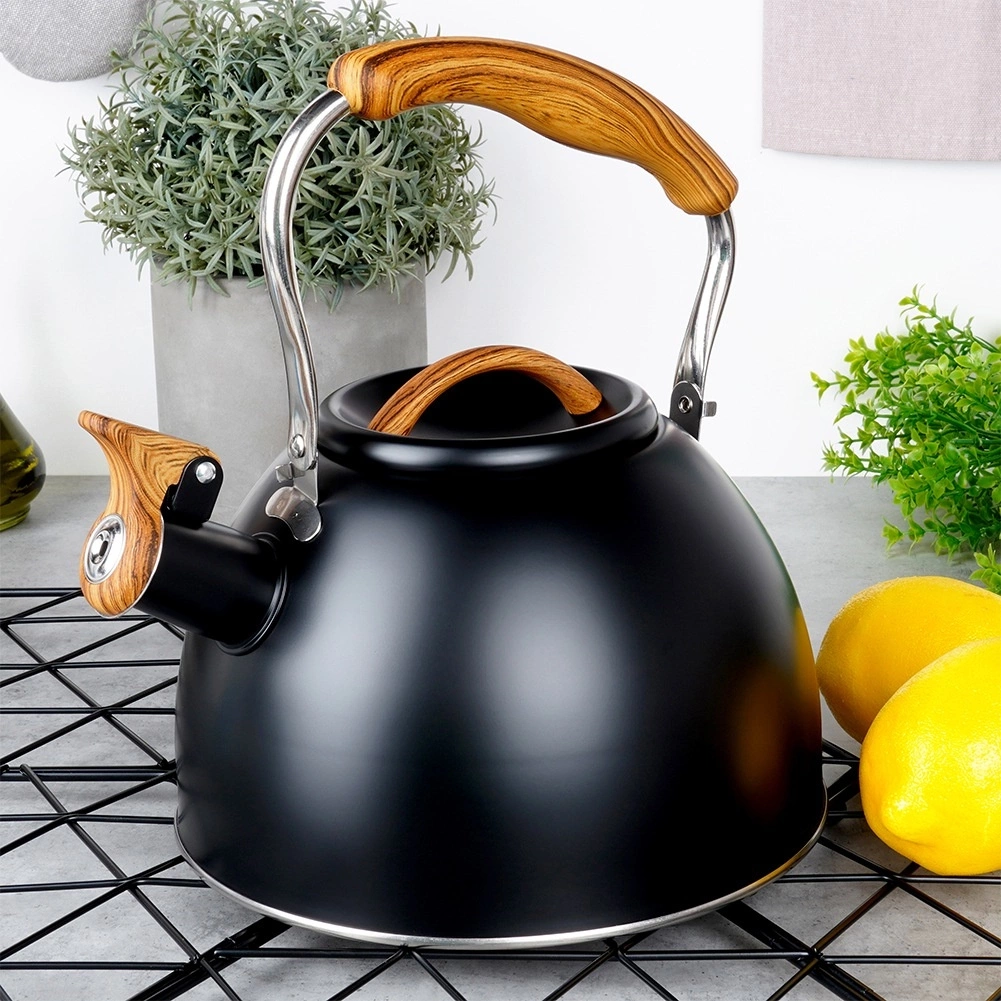 - Czajnik wykonany ze stali nierdzewnej - Klasyczny czajnik wykonany z najwyższej jakości stali nierdzewnej. Utrzymany w czarnym, matowym kolorze. Stal nierdzewna jest trwała oraz neutralna dla podgrzewanej wody, nie wpływa w żaden sposób na jej właściwości. Posiada uchylny gwizdek oraz zdejmowaną pokrywkę. Czajnik ma pojemność całkowitą 2,5 l oraz wysokość 24,5 cm, pojemność użytkowa wynosi 2,3 l.