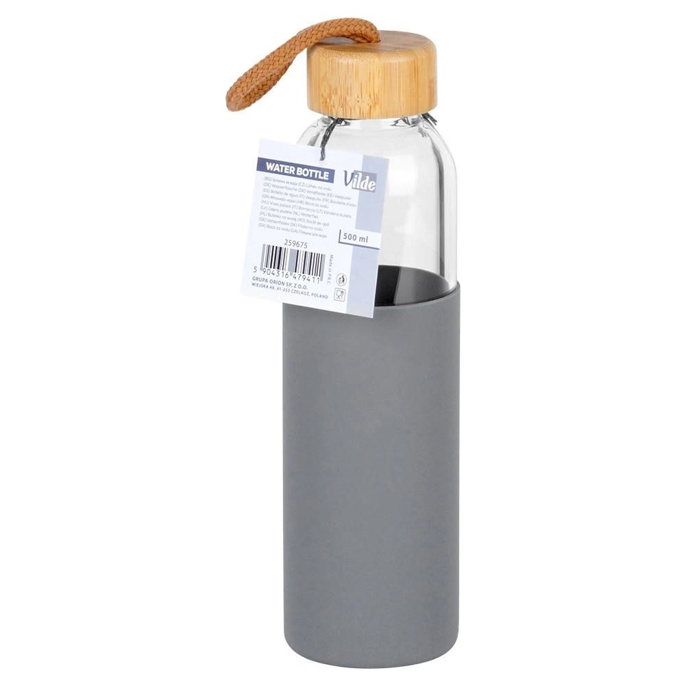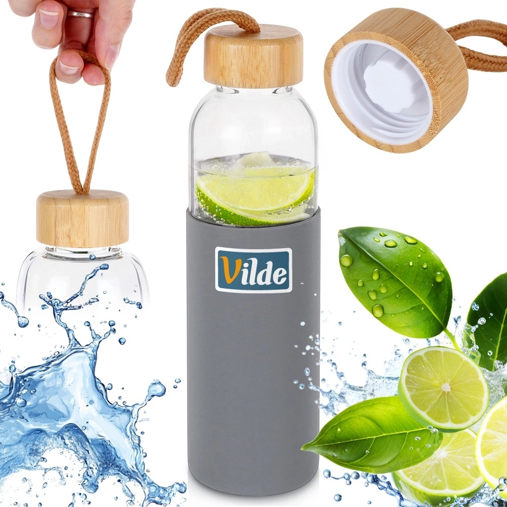 Butelka z bambusową zakrętką. Szczelna dzięki uszczelce. Wykonana z wytrzymałego szkła, więc nadaje się zarówno do napojów ciepłych jak i zimnych. Wygodna w trzymaniu, dzięki silikonowej powłoce oraz zawieszce umieszczonej w nakrętce. Klasyczny design sprawia, że butelka ma wyjątkowy styl. Odpowiednie nawilżenie w ciągu dnia jest bardzo ważne, dlatego warto butelkę mieć zawsze przy sobie. Butelka jest poręczna i wygodna w użytkowaniu. Oryginalny produkt marki Vilde. Wyprodukowano zgodnie z europejskimi standardami.