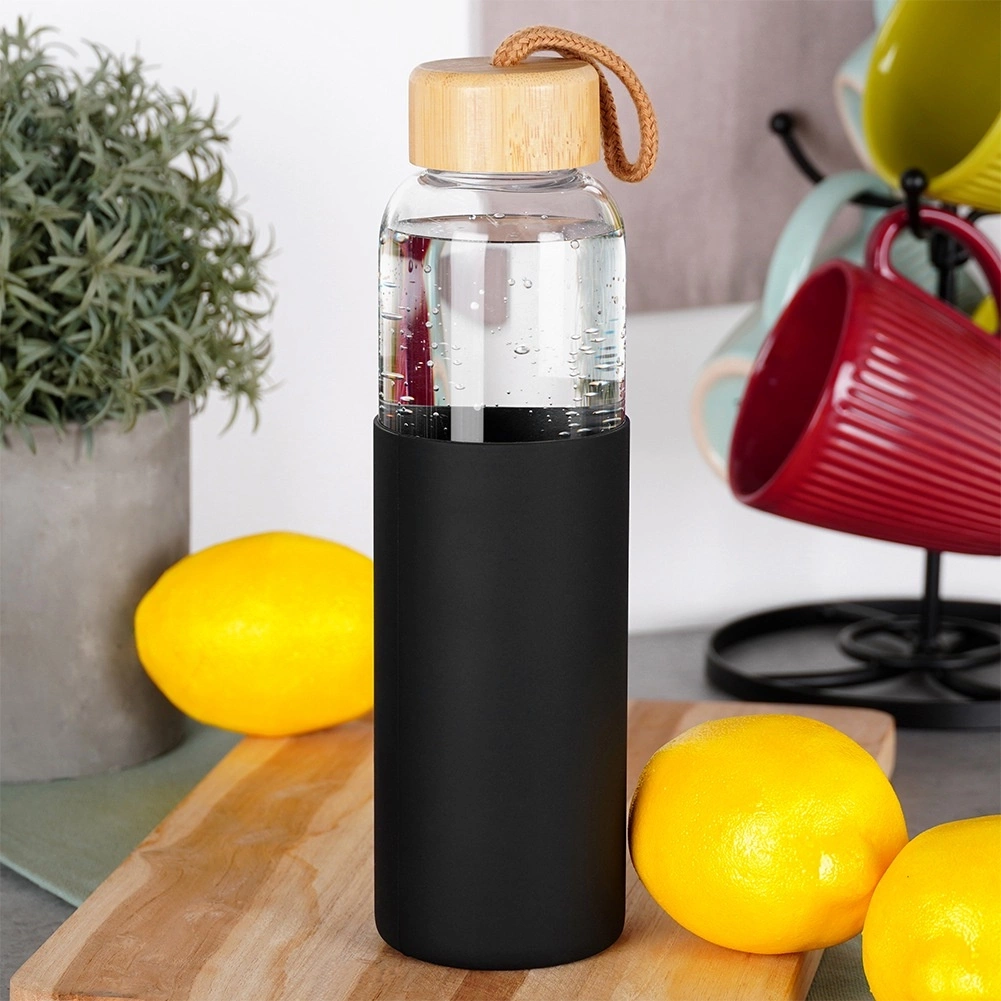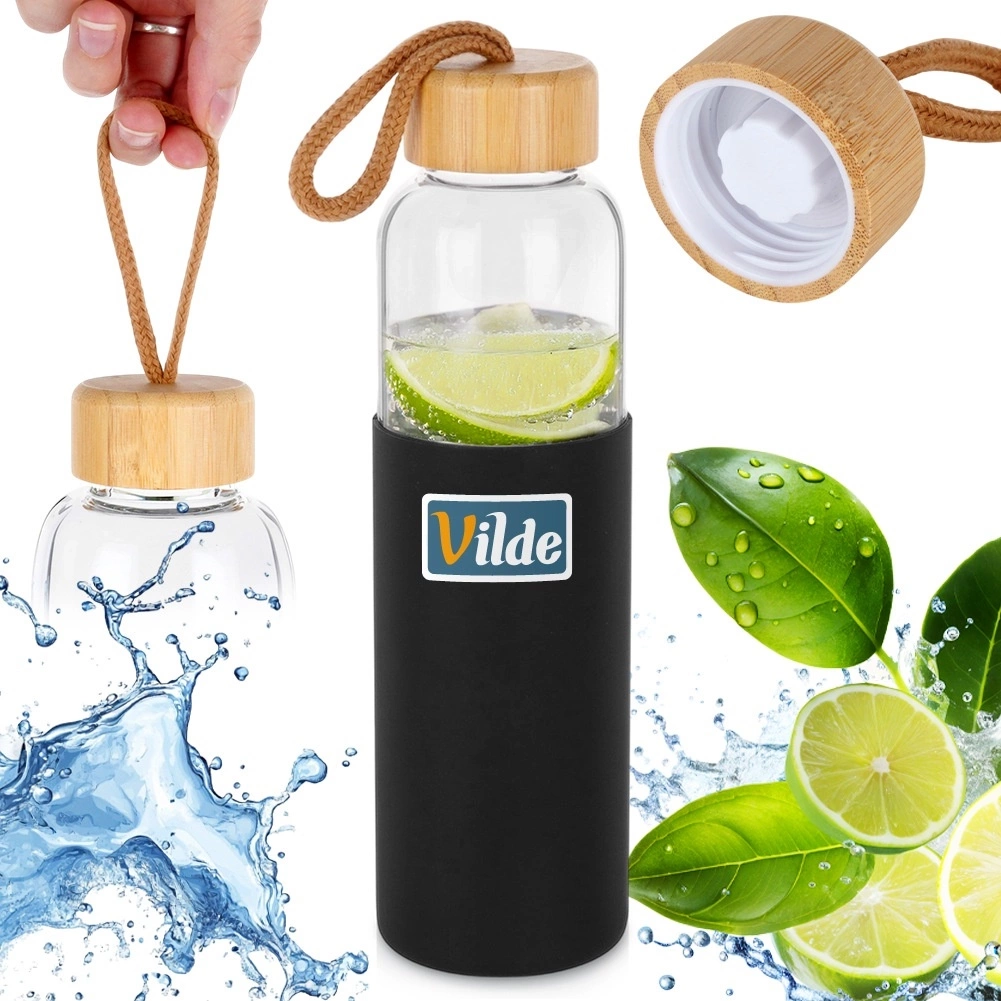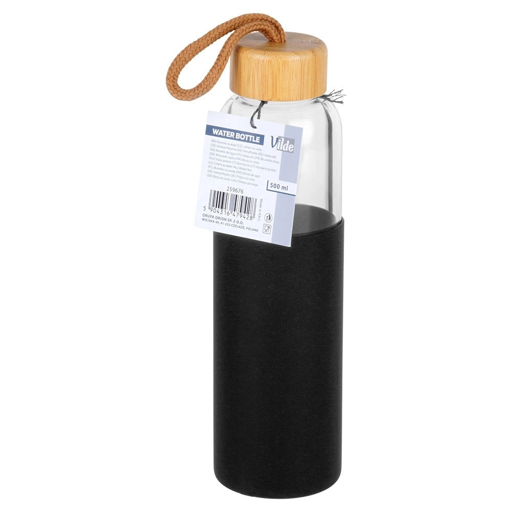 Butelka z bambusową zakrętką. Szczelna dzięki uszczelce. Wykonana z wytrzymałego szkła, więc nadaje się zarówno do napojów ciepłych jak i zimnych. Wygodna w trzymaniu, dzięki silikonowej powłoce oraz zawieszce umieszczonej w nakrętce. Klasyczny design sprawia, że butelka ma wyjątkowy styl. Odpowiednie nawilżenie w ciągu dnia jest bardzo ważne, dlatego warto butelkę mieć zawsze przy sobie. Butelka jest poręczna i wygodna w użytkowaniu. Oryginalny produkt marki Vilde. Wyprodukowano zgodnie z europejskimi standardami.