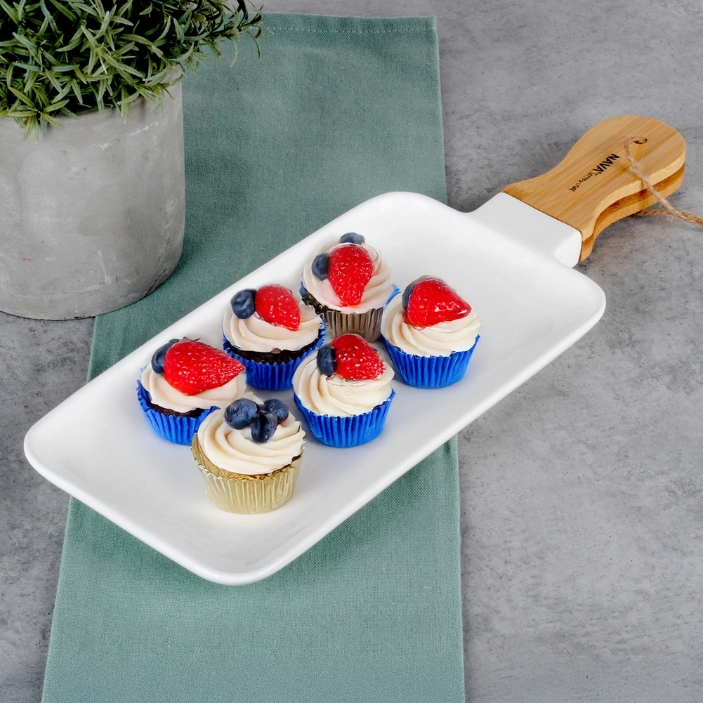 - Wykonany z porcelany - Talerz wykonany z najwyższej jakości porcelany w białym kolorze. Wyposażony w uchwyt wykonany z drewna bambusowego. Talerz jest wytrzymały i solidny.