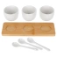 - Zestaw trzech miseczek z łyżeczkami na tacy - Zestaw trzech miseczek usadowionych na podłużnej tacy. Wymiar zewnętrzny zestawu wynosi 21,5 x 6,5 x 5,5 cm. Każda z miseczek ma wymiary 6,7 x 4,5 cm i pojemność 90 ml. Do zestawu dołączone są również łyżeczki o długości 10 cm.