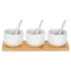 Zestaw trzech miseczek z łyżeczkami na drewnianej tacy, która posiada wygodny i efektowny uchwyt. Wykorzystamy je do serwowania przekąsek, przystawek, sosów i dipów. Serwowane sosy lub przekąski są umieszczone w jednym miejscu, dzięki czemu wygodnie je przeniesiemy. Miseczki wykorzystamy podczas rodzinnych uroczystości i spotkań ze znajomymi. Przydadzą się również do serwowania sosów podczas grillowania. Zestaw sprawdzi się do użytku domowego oraz w gastronomii. Idealny pomysł na prezent np. z okazji parapetówki. Oryginalny produkt marki Vilde. Wyprodukowano zgodnie z europejskimi standardami.