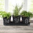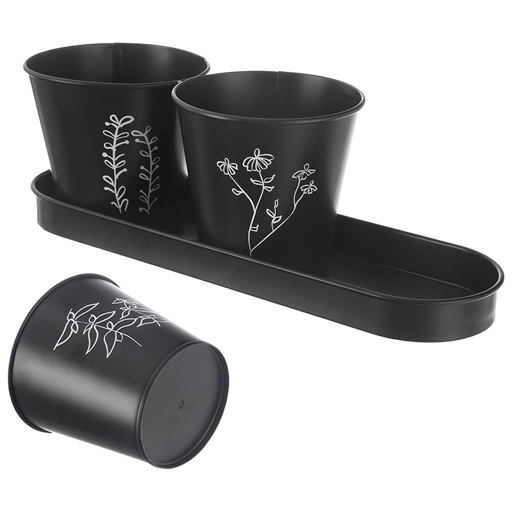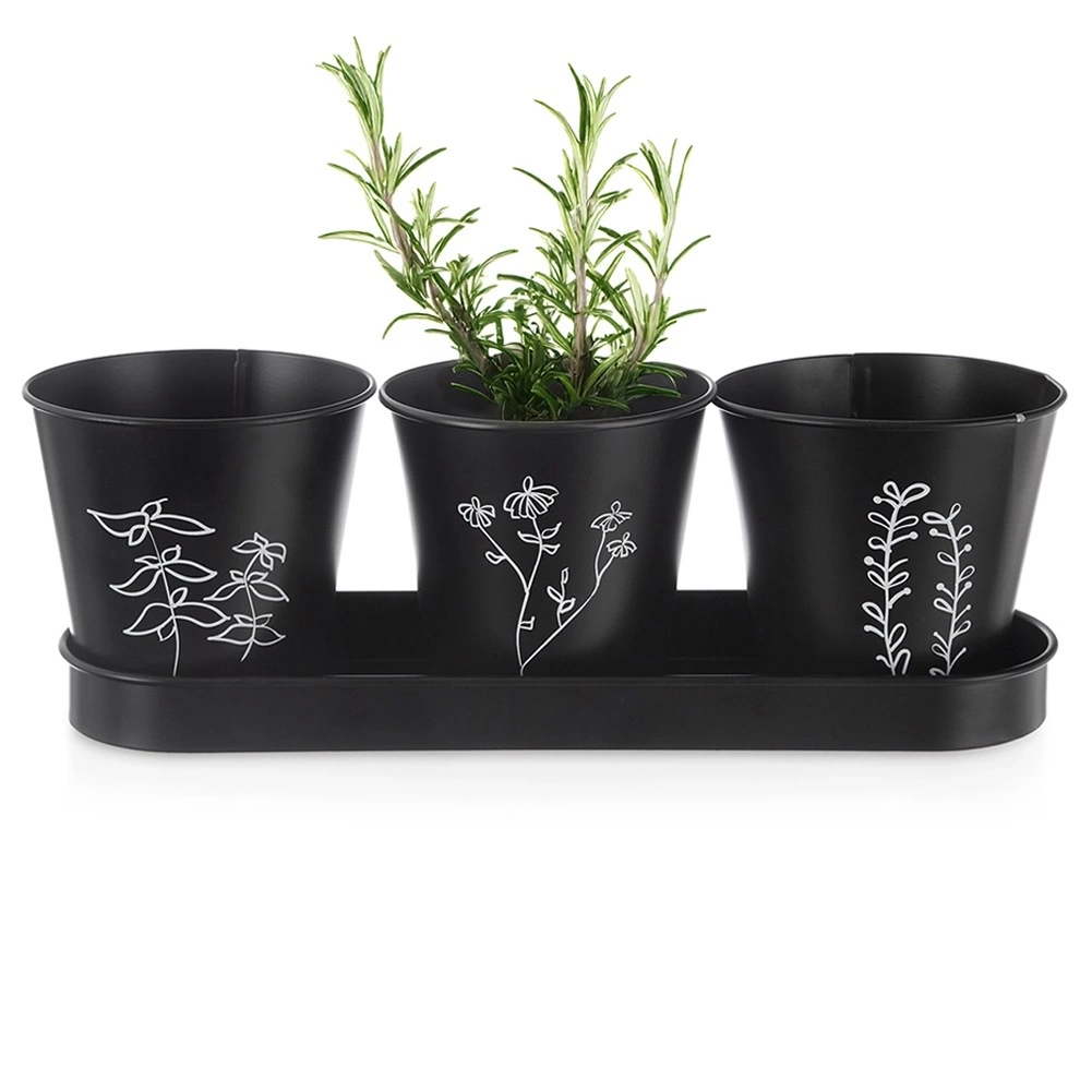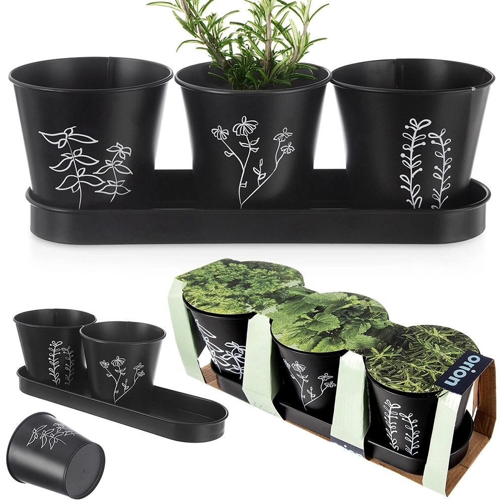 - Zestaw trzech doniczek na zioła - Zestaw składa się z trzech doniczek oraz podstawki. Idealne do uprawy świeżych ziół w kuchni lub na parapecie. Każda osłonka ma wymiary: średnica górna 11 cm, średnica dolna 7,5 cm, wysokość 10,5 cm. Zestaw doniczek umieszczonych na podstawce ma wymiar 31,5 x 11 x 10,5 cm. Doniczki z serii Blackline.