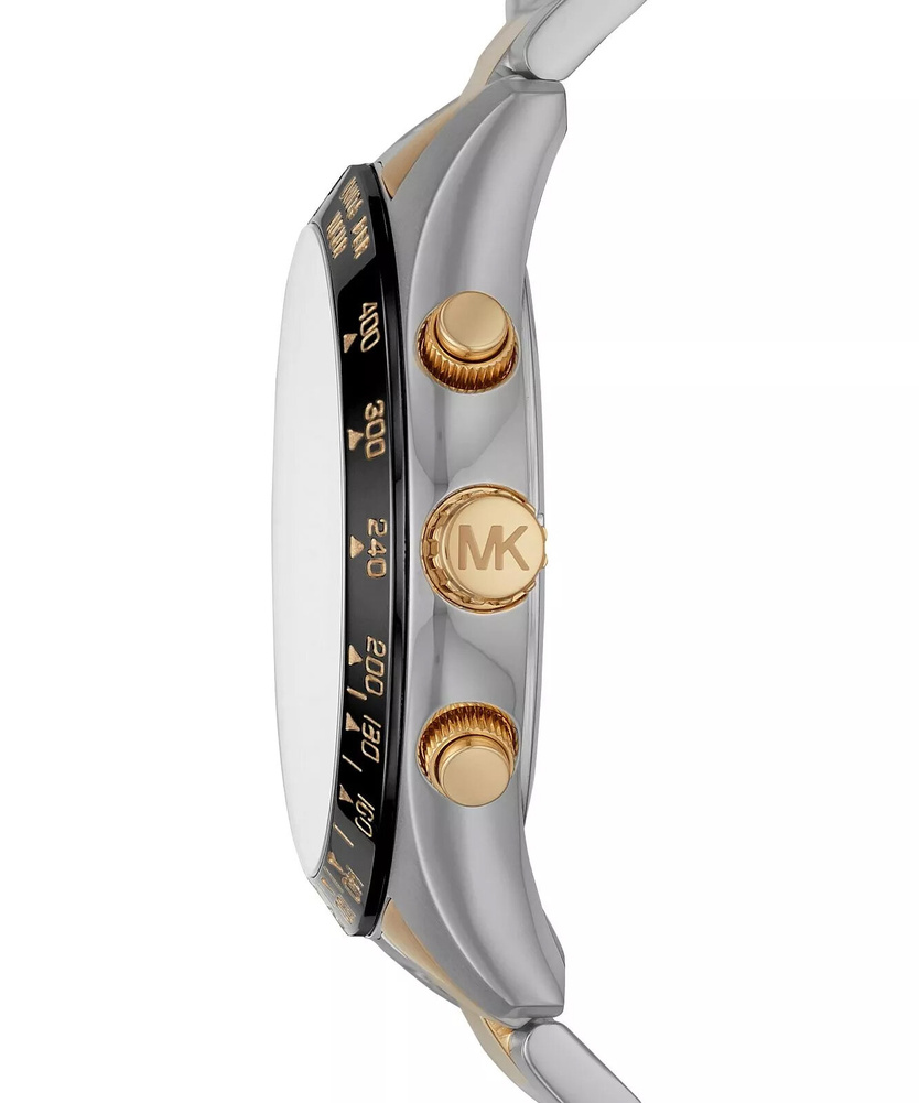 Model Michael Kors MK8784 to elegancki męski zegarek na bransolecie w kolorze srebrnym / złotym wykonanej ze stali szlachetnej. Wyposażony jest w precyzyjny mechanizm kwarcowy, dzięki któremu zegarek dokładanie pokazuje aktualną godzinę. Dostępne funkcje to chronograf, datownik dnia miesiąca oraz 24-godzinne wskazanie czasu. Tarczę ochrania mineralne, odporne na zarysowania szkiełko.