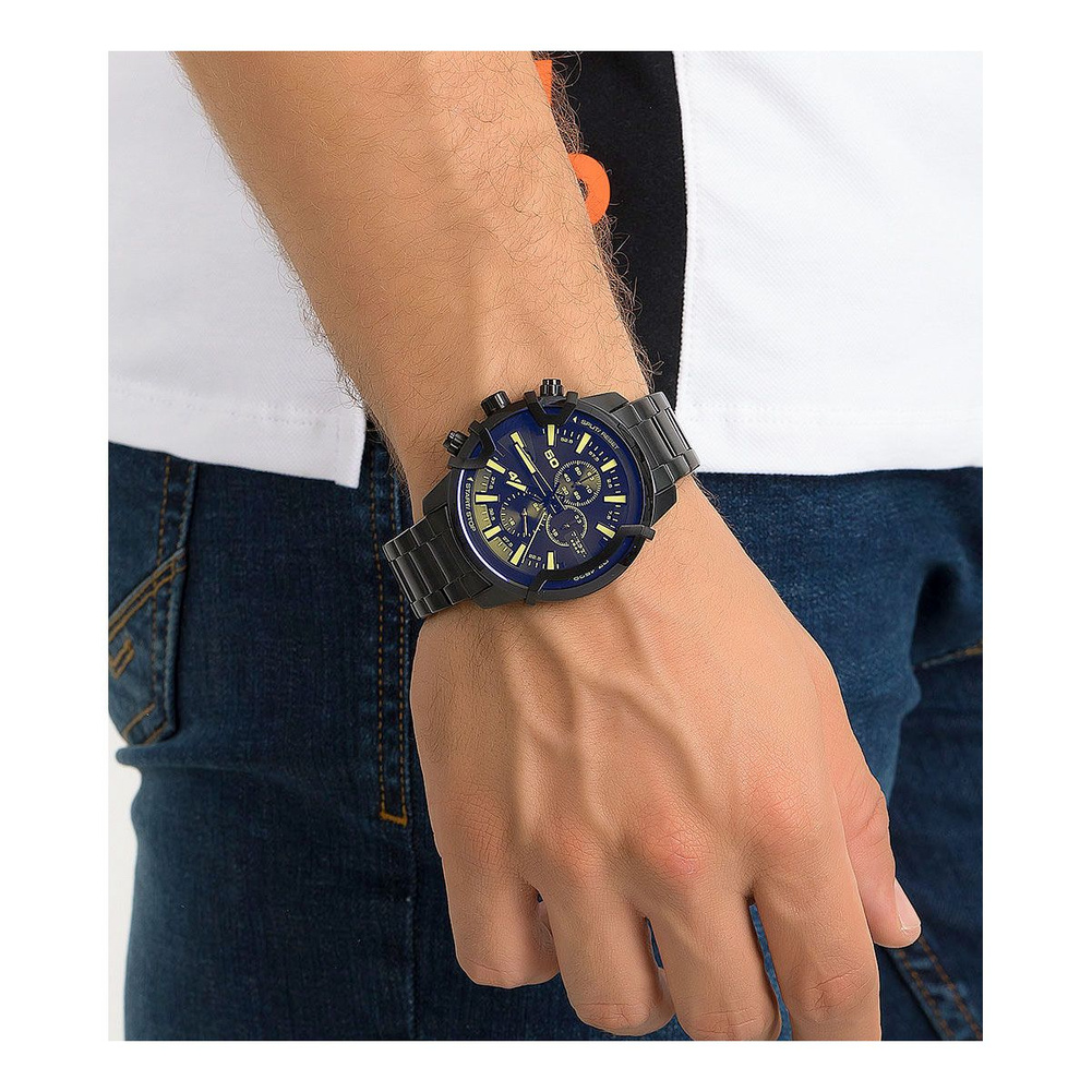 Zegarek Diesel Griffed DZ4529 to wybór dla mężczyzn, którzy cenią sobie wyraziste akcenty w czarnym kolorze. Jego elegancka konstrukcja obejmuje okrągłą kopertę oraz bransoletę ze stali nierdzewnej, odpornej na korozję, a także analogowy cyferblat chroniony szkiełkiem mineralnym. Na tarczy znajdziesz datownik oraz subtarcze dla chronografu. Koronka i przyciski do obsługi funkcji komplikacji znajdują się po lewej stronie koperty. Z wodoodpornością na poziomie 50 metrów zegarek jest odporny na zachlapania, co zapewnia ochronę mechanizmu kwarcowego.