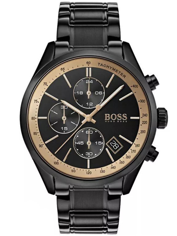 Zegarek męski Hugo Boss 1513578 z serii Grand Prix to niezwykle elegancki męski zegarek, idealny zarówno do eleganckiego ubioru jak i do noszenia na co dzień. Model tego zegarka posiada czarną bransoletę oraz kopertę - obie wykonane ze stali szlachetnej. Na tarczy w kolorach złotym i czarnym zabezpieczonej mineralnym szkłem znajdziemy datownik wskazujący dzień miesiąca oraz subtarcze będące wskazaniami chronografu oraz czasu dobowego.