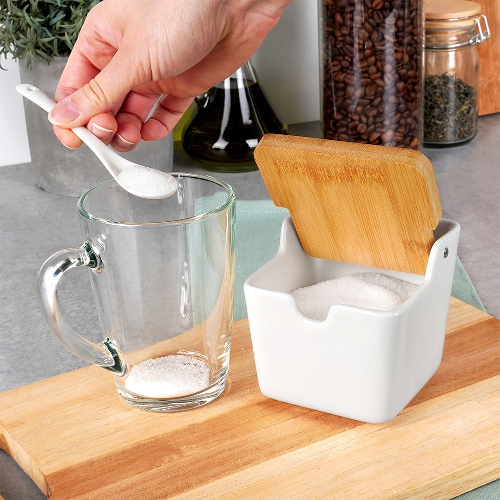 - Wykonana z ceramiki i bambusa - Cukiernica i łyżeczka wykonane są z najwyższej jakości ceramiki w białym kolorze. Pokrywka wykonana z drewna bambusowego. Odpowiednio użytkowana posłuży długie lata.