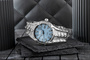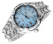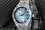 Ten model to odważne połączenie industrialnego designu z nowoczesnym, niemal biomechanicznym charakterem. Hipnotyzująca, błękitna tarcza o subtelnym, promienistym szlifie przywodzi na myśl lodową powierzchnię oceanu – spokojną, ale skrywającą w sobie potężną siłę. Gra światła na jej powierzchni sprawia, że każdy kąt patrzenia ujawnia inny odcień, od chłodnego srebra po intensywny błękit. To, co wyróżnia ten model, to unikatowa bransoleta, której ogniwa przypominają metalowy kręgosłup – surowy, ale precyzyjnie dopracowany w każdym detalu. Ta futurystyczna konstrukcja nie tylko wygląda niezwykle, ale również idealnie dopasowuje się do nadgarstka, tworząc efekt drugiej skóry. Centralne, polerowane elementy dodają całości agresywnego, nowoczesnego charakteru, a szczotkowane powierzchnie sprawiają, że zegarek pozostaje stylowy i wyrafinowany.
