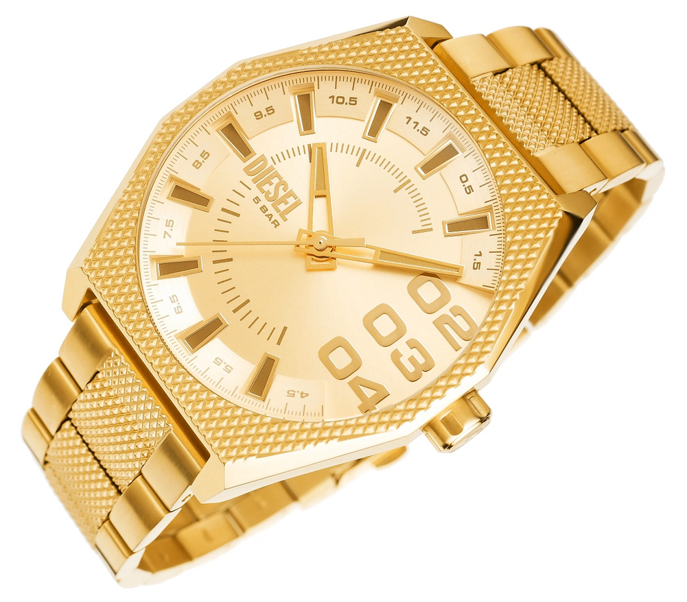Diesel Scarper DZ2173 to zegarek, który przyciąga wzrok i budzi respekt. Jego złota, heksagonalna koperta i masywna bransoleta emanują dominacją, tworząc dodatek, który mówi więcej niż tysiąc słów. Każdy detal – od grawerowanej faktury po trójwymiarowe cyfry na tarczy – podkreśla jego surową, ale luksusową estetykę.