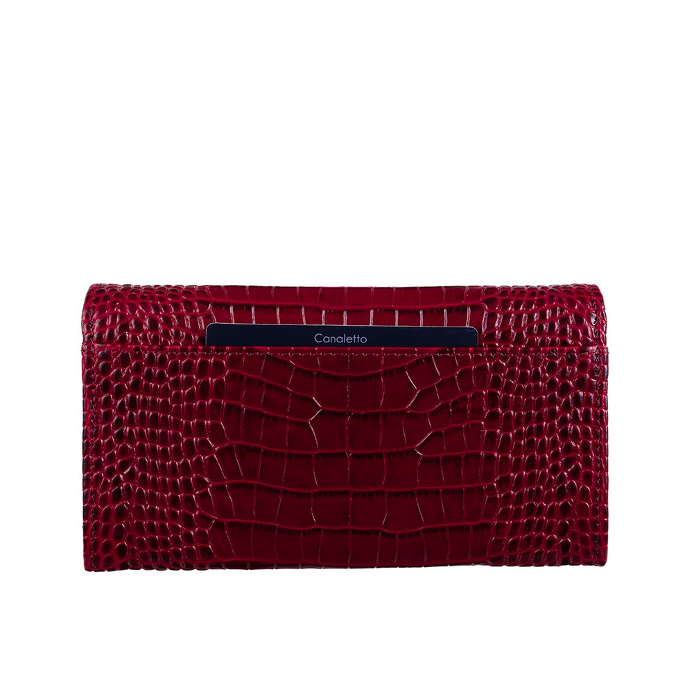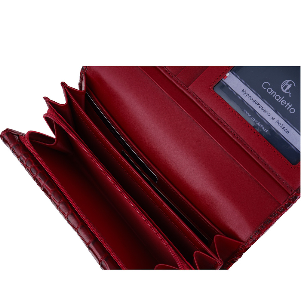 Portfel został wykonany z wysokiej jakości skóry licowej ze wzorem krokodyla, co nadaje mu elegancki i luksusowy charakter. Metalowa sygnatura Canaletto stanowi subtelny, ale wyrazisty akcent, który podkreśla markowy charakter tego dodatku.