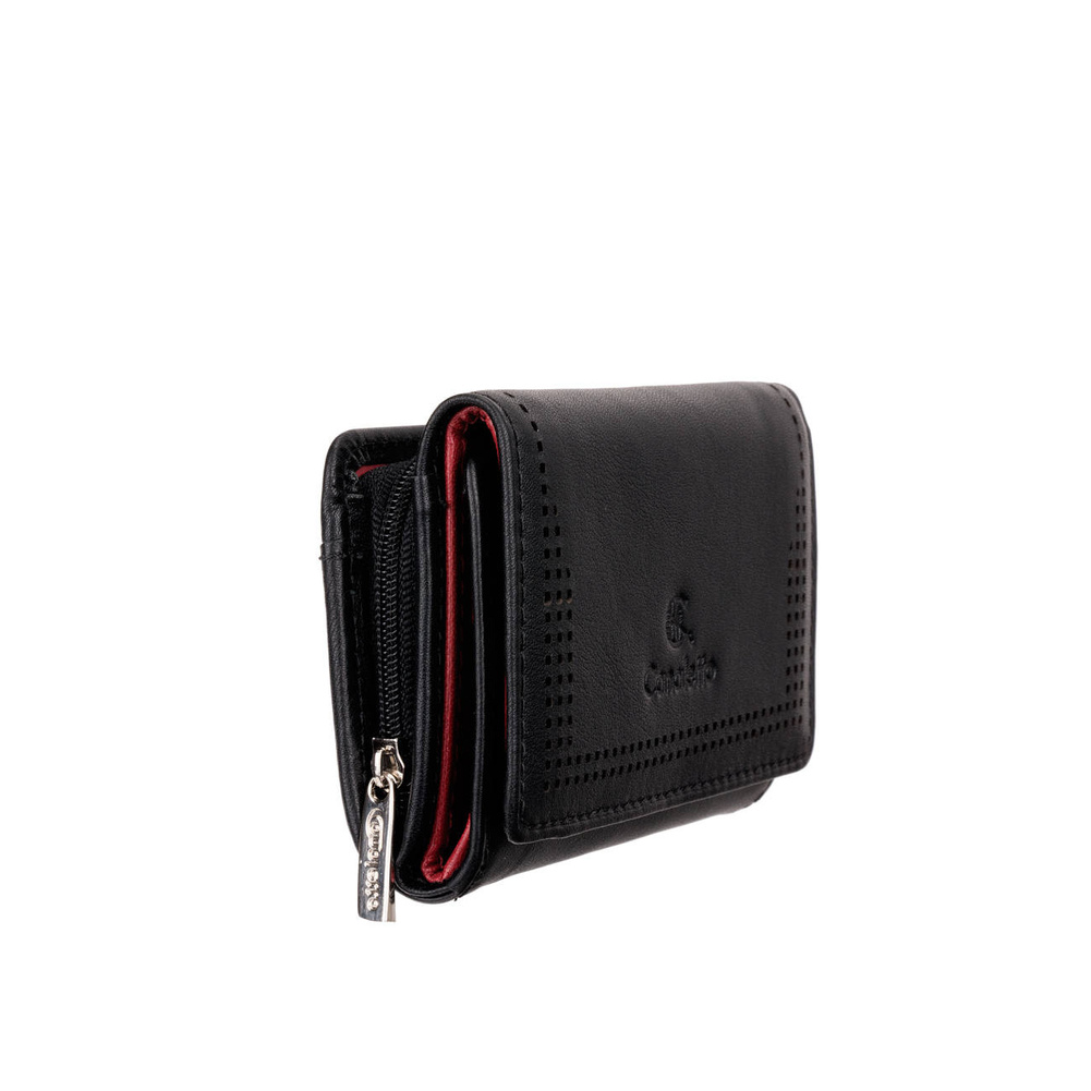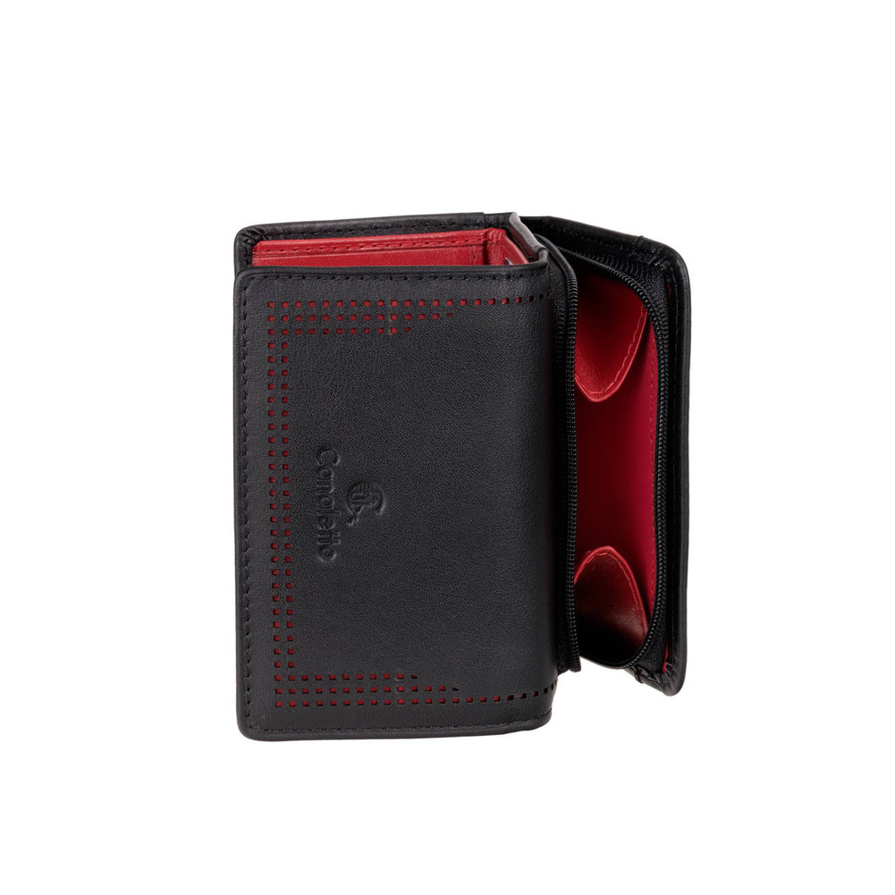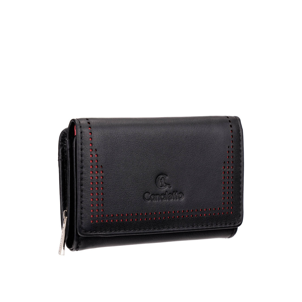 • Stylowy czarny portfel damski Canaletto z naturalnej skóry licowej z perforacją laserową. Posiada około 10 przegródek na karty, okienko na zdjęcie, kieszeń na monety oraz przegrodę na banknoty. Polski produkt najwyższej jakości.
