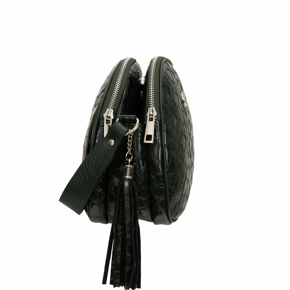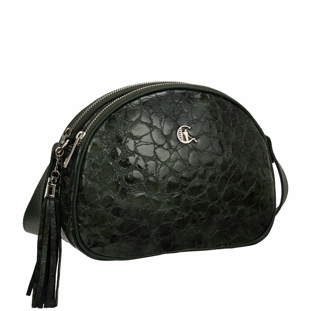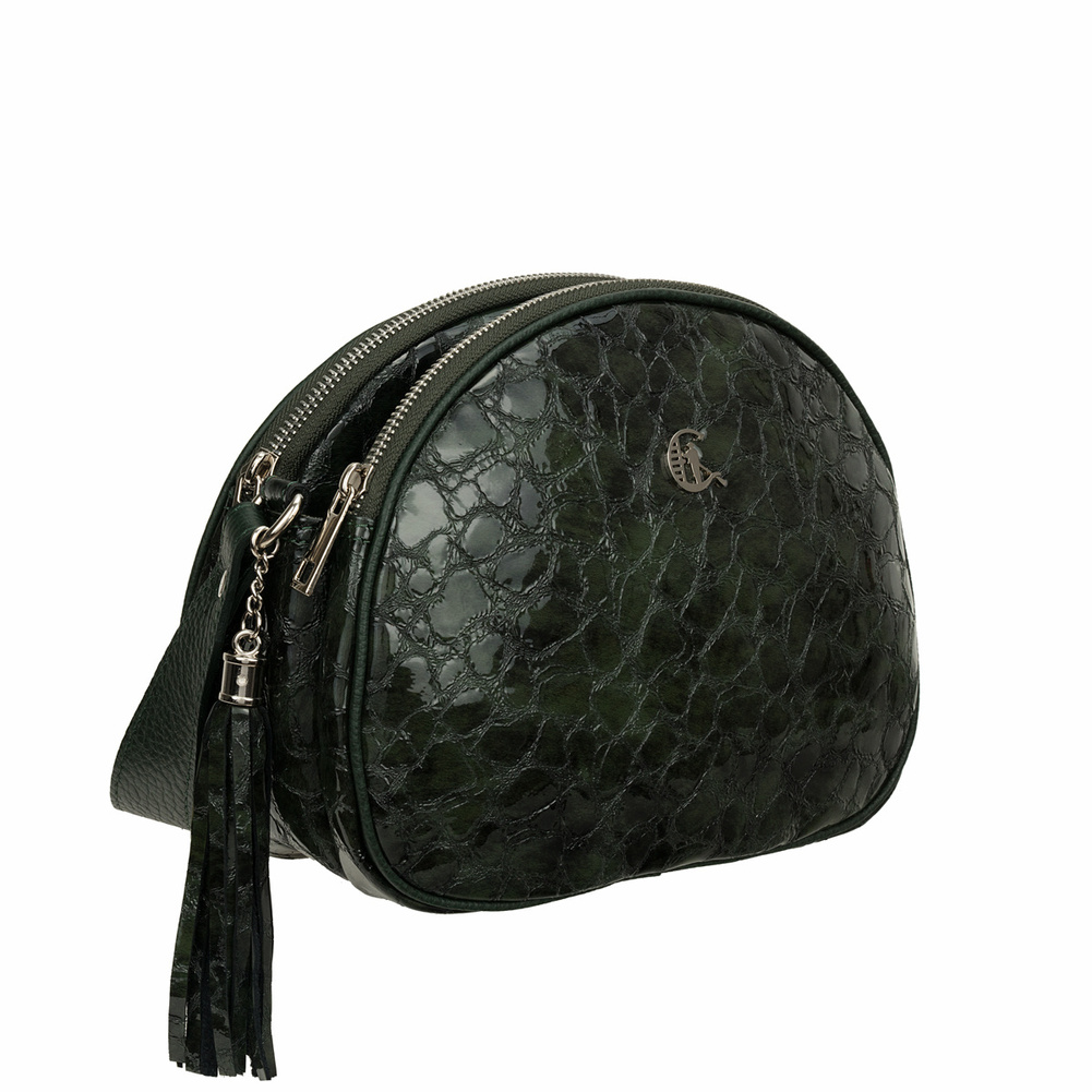 Torebka zachwyca głębokim, zielonym kolorem i eleganckim połyskiem skóry lakierowanej, które przyciągają wzrok i dodają jej wyrafinowanego charakteru. Subtelny ozdobny frędzel stanowi stylowy akcent, który dopełnia całość.