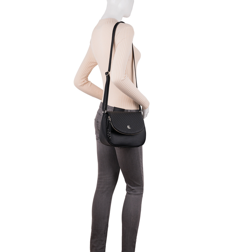 Torebka wyróżnia się klapką z tłoczeniem o wzorze plecionki, która nadaje jej unikalnego charakteru i subtelnego uroku. Ozdobna zawieszka z nitami stanowi stylowy akcent, który podkreśla nowoczesny design tego modelu.