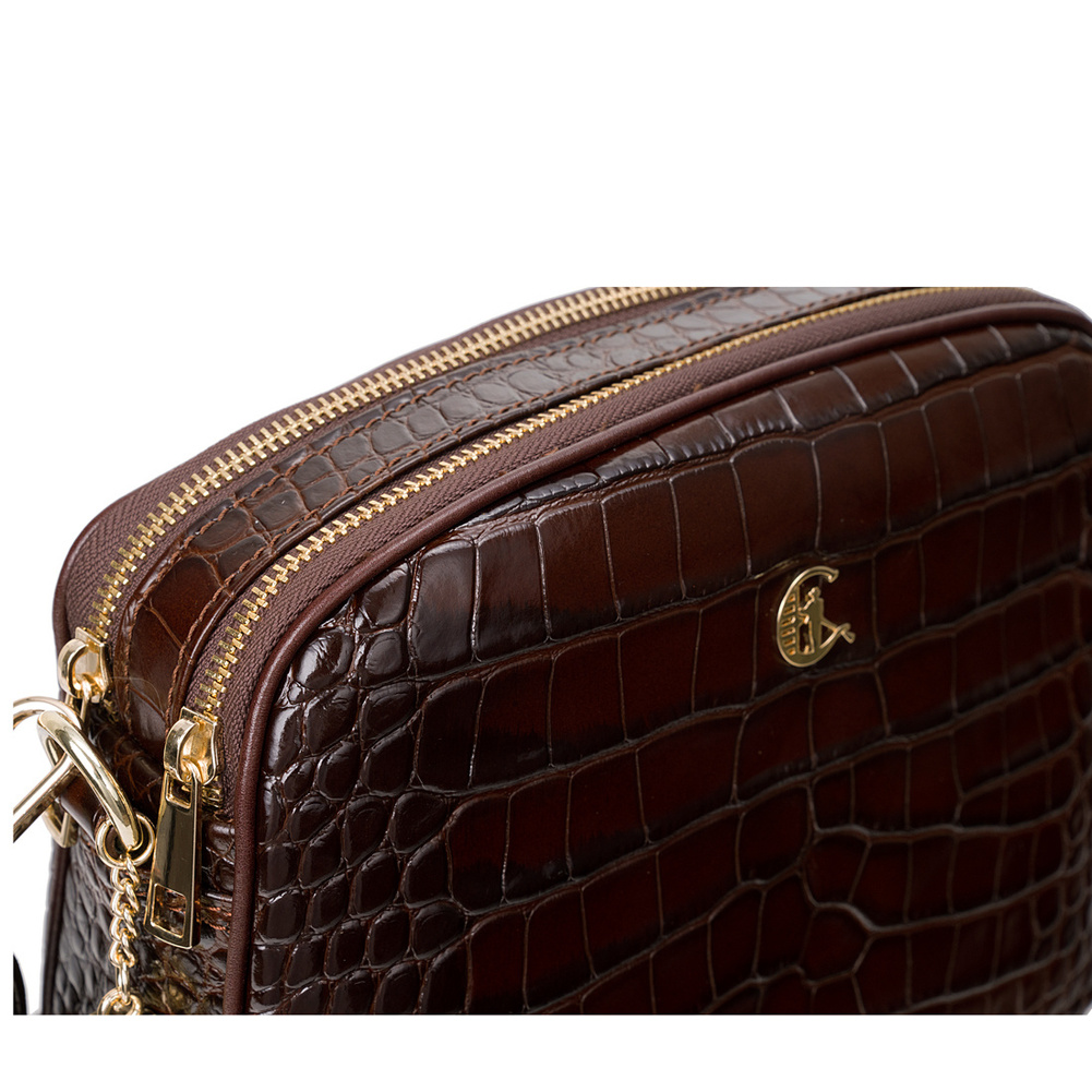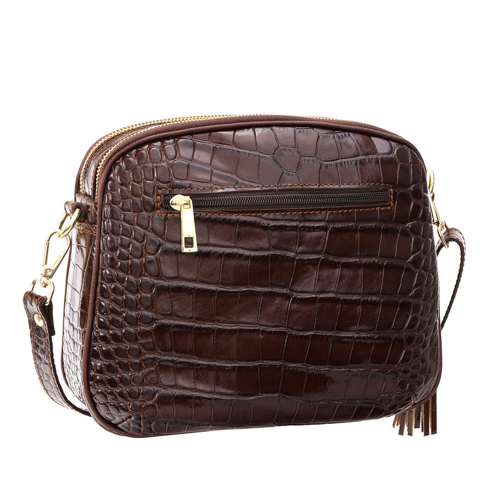 Wykonana z wysokiej jakości naturalnej skóry licowej tłoczonej na wzór krokodyla, torebka przyciąga wzrok i podkreśla styl właścicielki. Struktura skóry krokodyla nadaje jej ekskluzywny wygląd oraz sprawia, że staje się ponadczasowym dodatkiem.