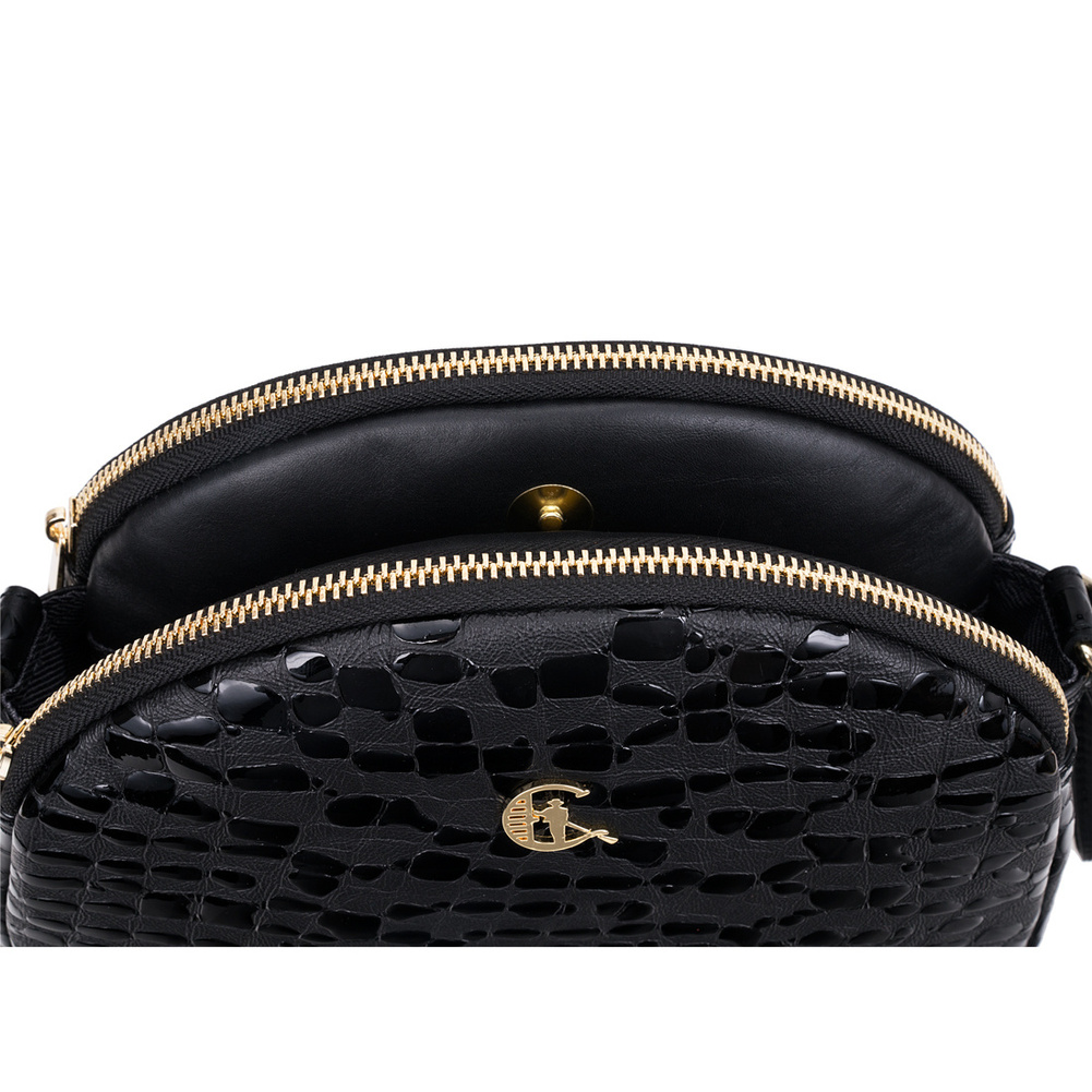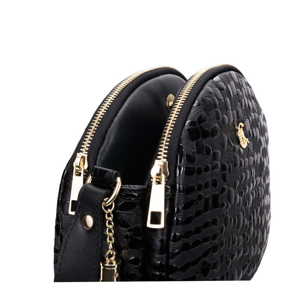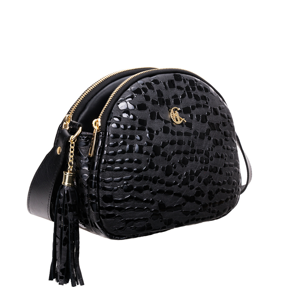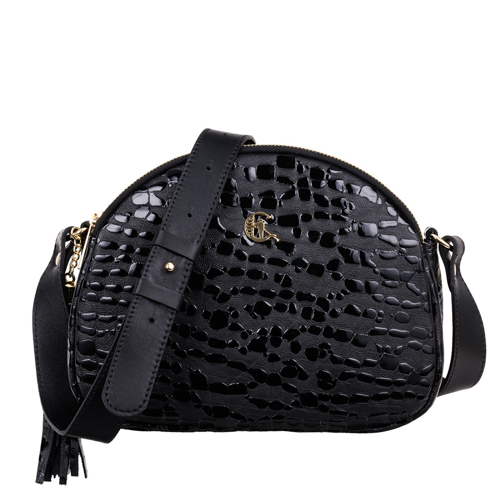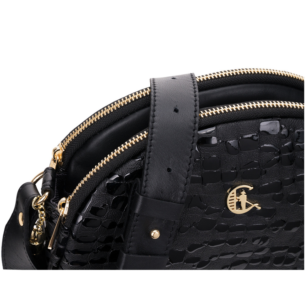 • Czarna torebka Canaletto wykonana z naturalnej skóry z imitacją kropli. Trzy komory, regulowany pasek i eleganckie detale. Polski produkt najwyższej jakości!