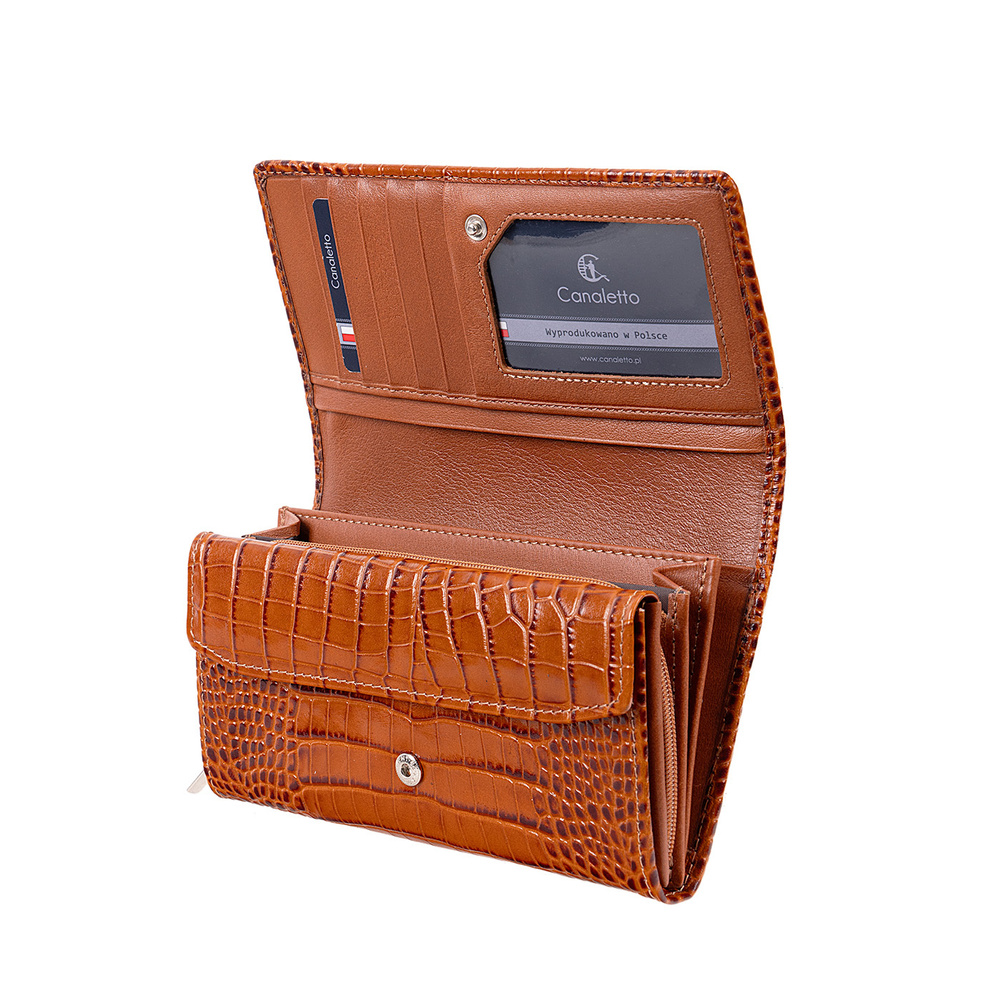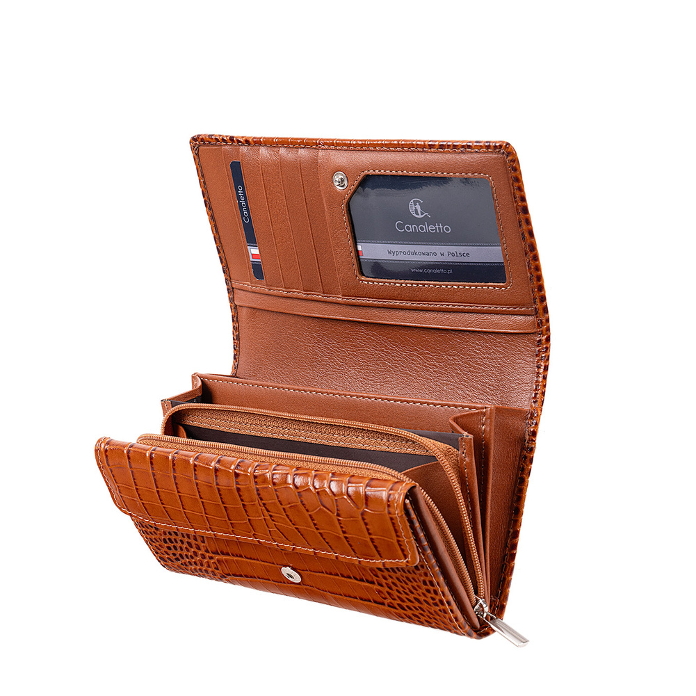 Portfel został wykonany z wysokiej jakości skóry licowej ze wzorem krokodyla, co nadaje mu elegancki i luksusowy charakter. Metalowa sygnatura Canaletto stanowi subtelny, ale wyrazisty akcent, który podkreśla markowy charakter tego dodatku.