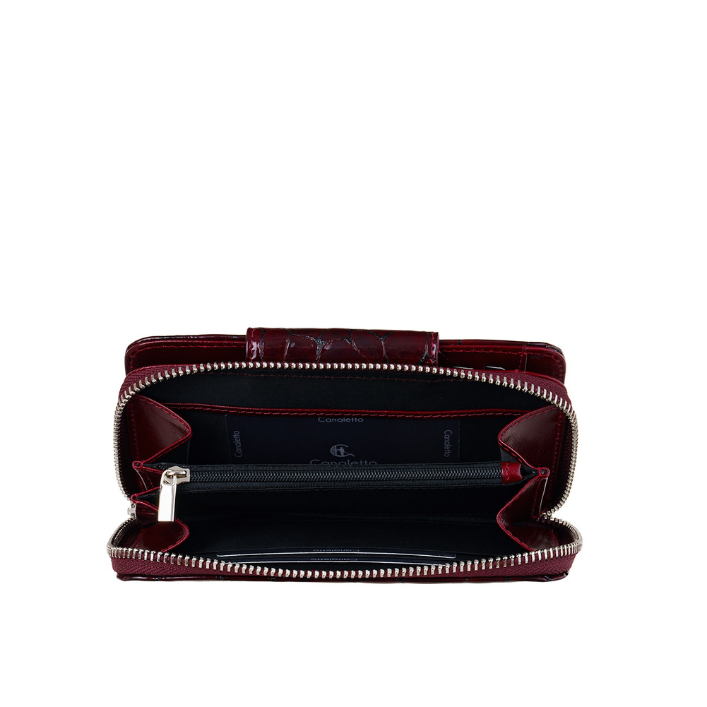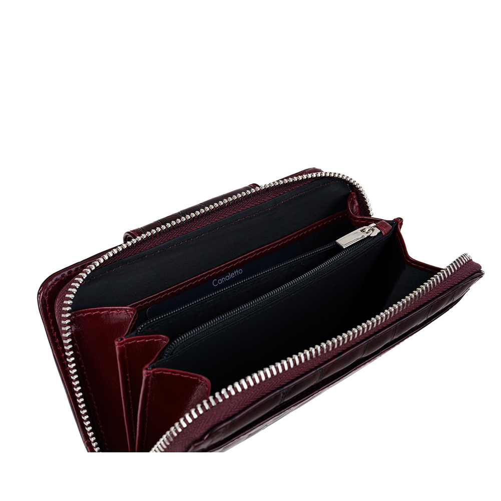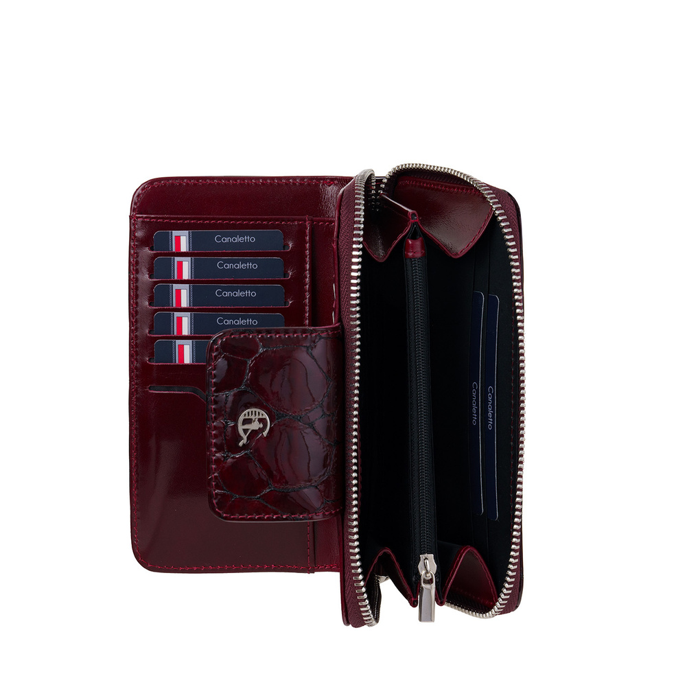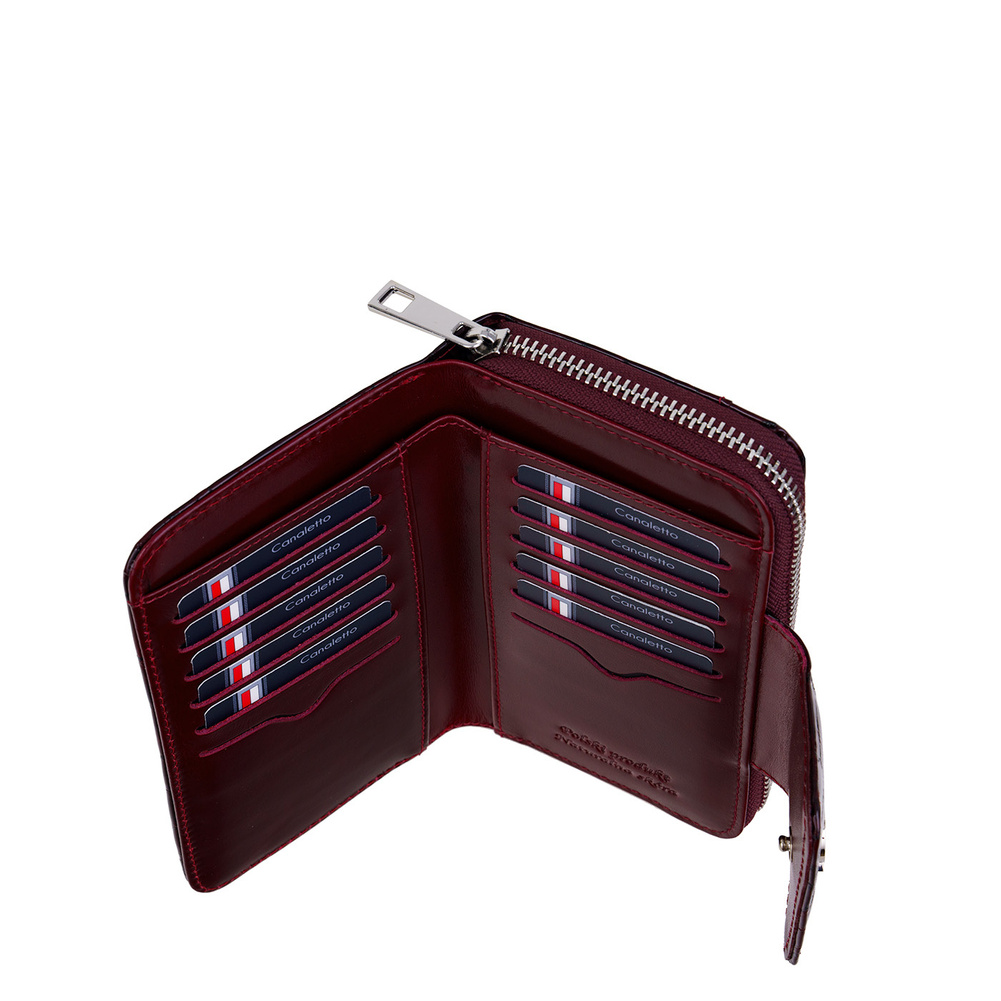 Portfel damski marki Canaletto zachwyca ponadczasowym stylem, eleganckim wykończeniem i przemyślaną funkcjonalnością. Wykonany z naturalnej skóry licowej w lakierowanym bordowym wykończeniu, wyróżnia się głębokim, intensywnym kolorem i lustrzanym połyskiem, który dodaje mu luksusowego charakteru. To idealny wybór dla kobiet, które poszukują dodatku łączącego estetykę, trwałość i praktyczność.